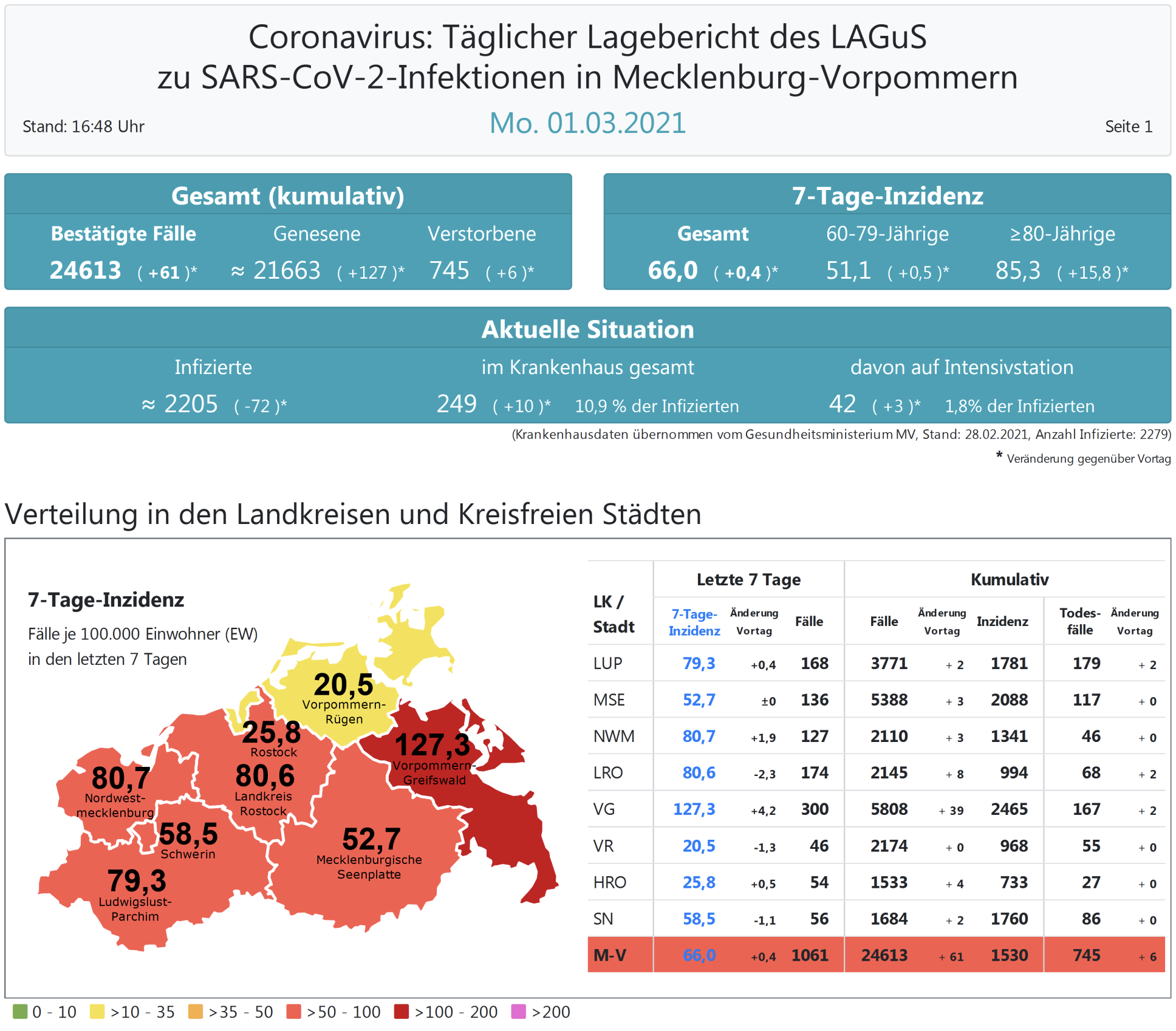 Der Inzidenzwert für ganz Mecklenburg-Vorpommern ist leicht gestiegen und liegt heute bei 66,0 (gestern 65,7 ). Insgesamt meldet das Land Mecklenburg-Vorpommern heute 61 Neuinfektionen. Die höchste Inzidenz hat nach wie vor der Landkreis Vorpommern-Greifswald mit jetzt 127,3.