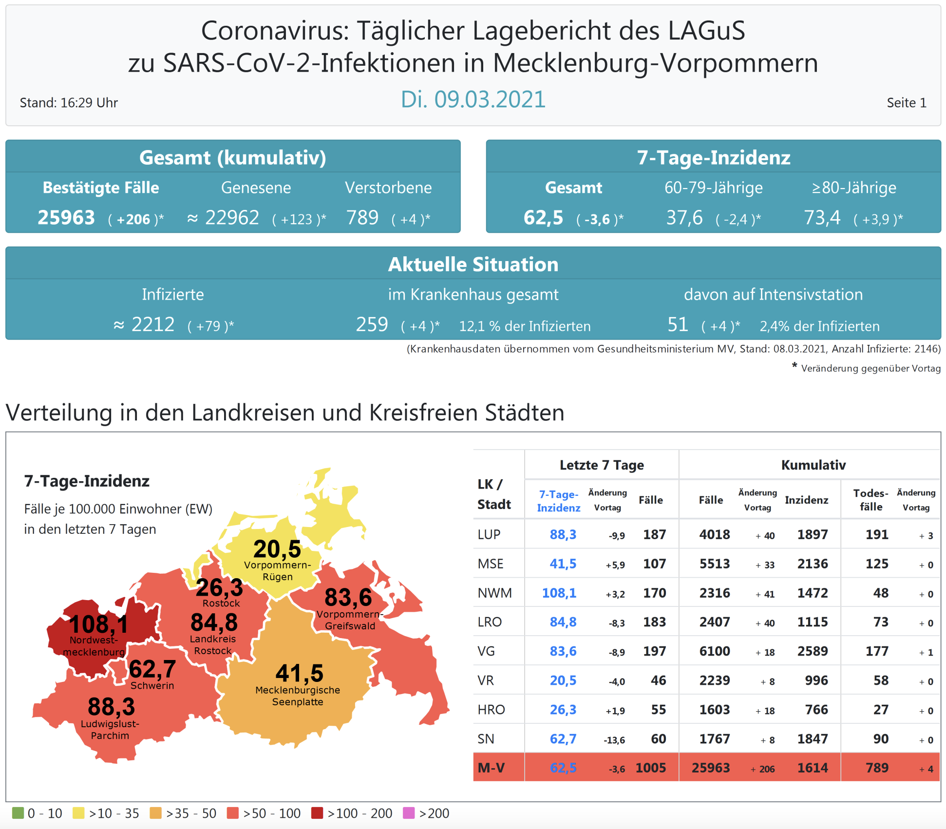Der Inzidenzwert für ganz Mecklenburg-Vorpommern ist gesunken und liegt heute bei 62,5 (gestern 66,1 ). Insgesamt meldet das Land Mecklenburg-Vorpommern heute 206 Neuinfektionen. Die höchste Inzidenz hat der Landkreis Nordwestmecklenburg mit heute 108,1.