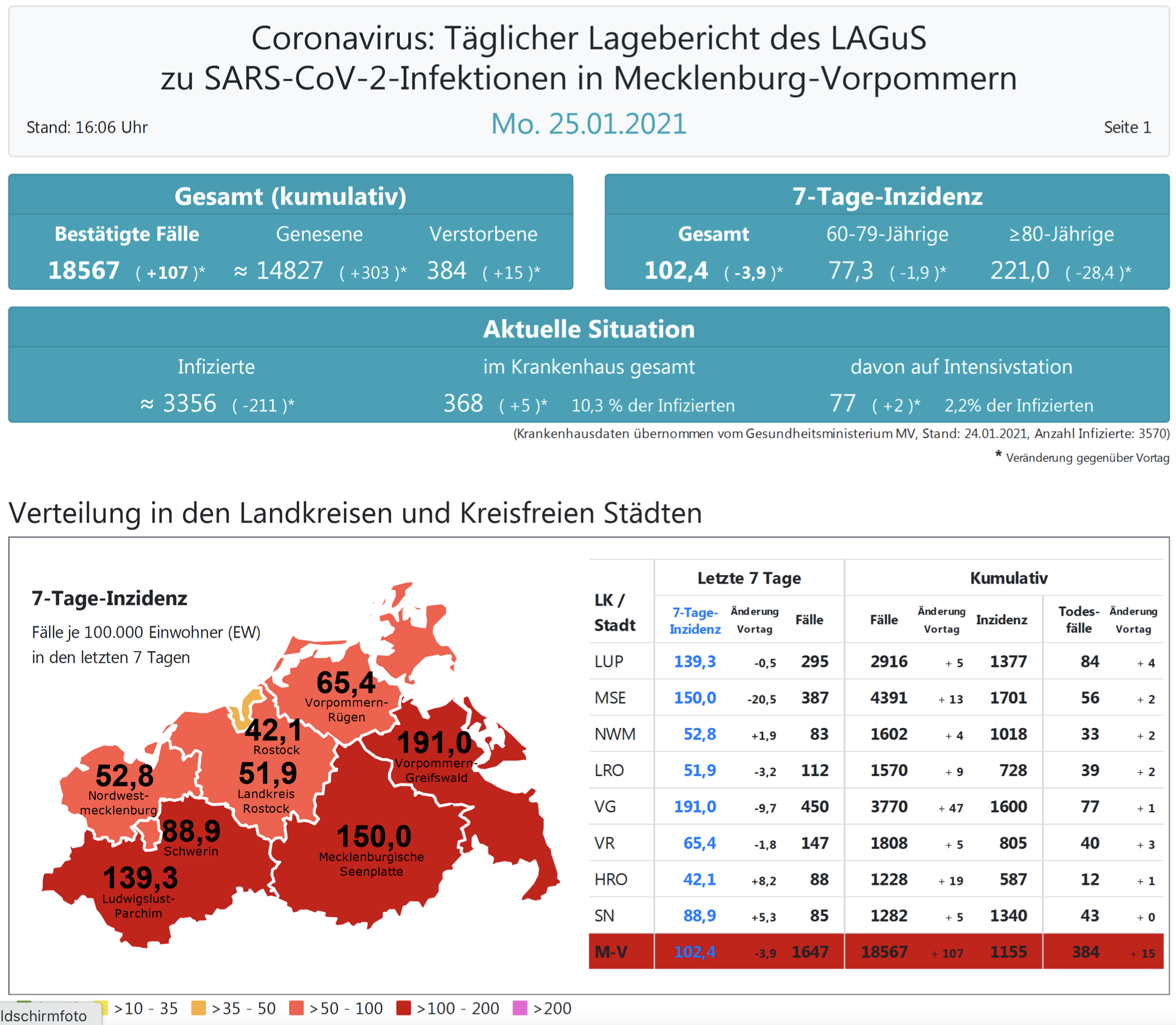 Insgesamt meldet das Land Mecklenburg-Vorpommern heute 107 Neuinfektionen. In ganz Mecklenburg-Vorpommern liegt der Inzidenzwert heute bei 102,4 (gestern 106,5).