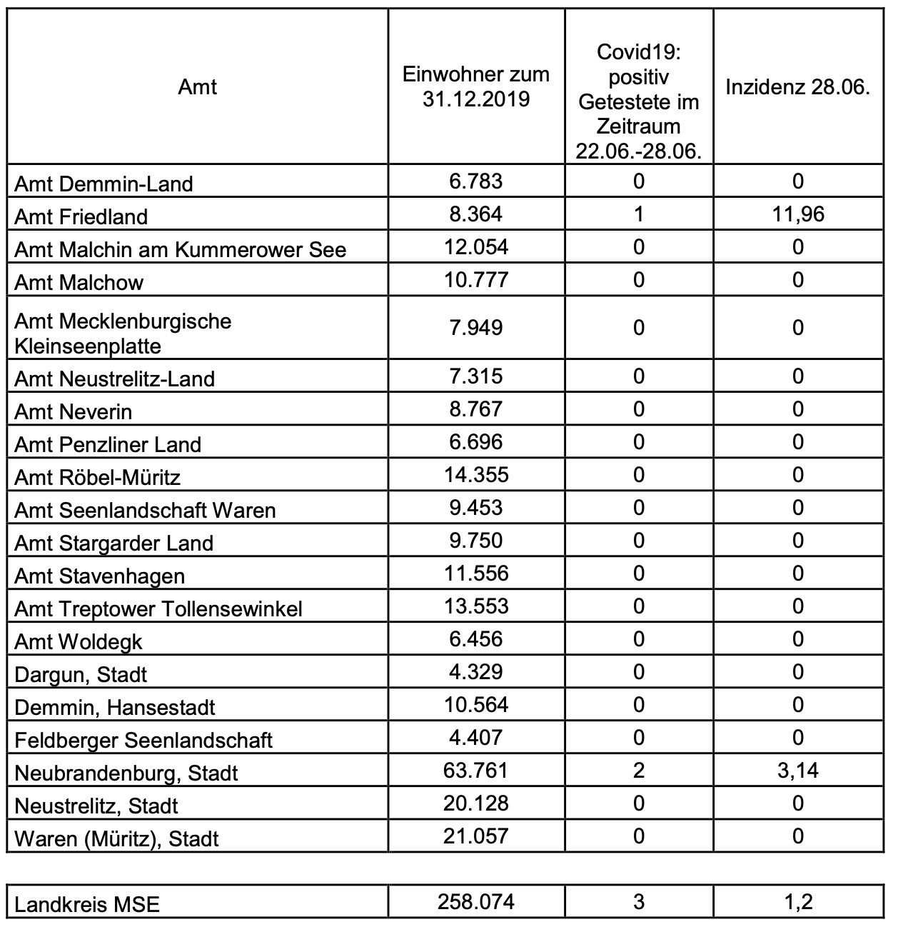 Auch heute wieder ganz viele „Nullen“: Der Landkreis hat wie immer dienstags die Inzidenzen der Städte und Ämter veröffentlicht. Bis auf das Amt Friedland und die Stadt Neubrandenburg melden alle eine glatte Null.