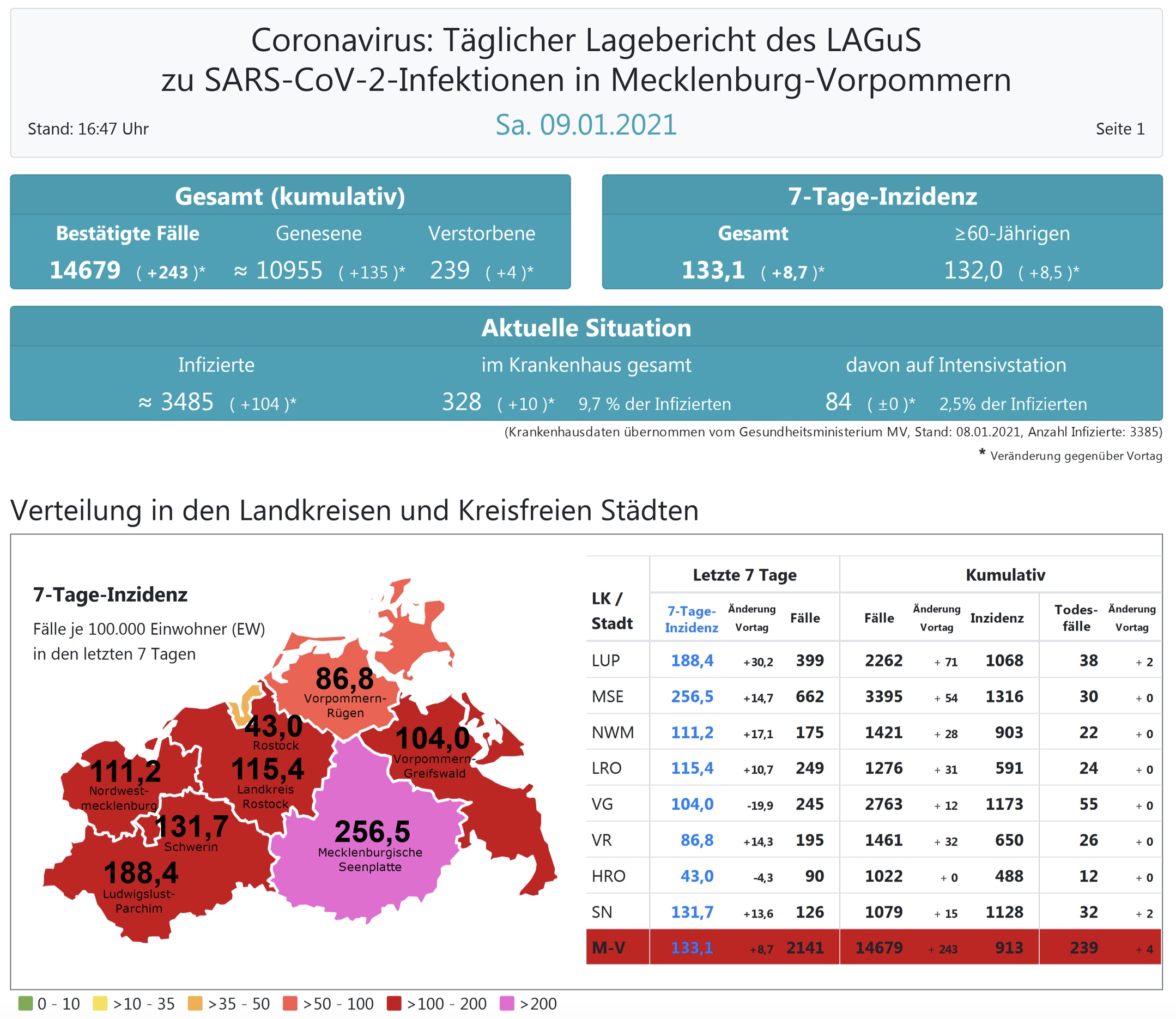 Insgesamt wurden in Mecklenburg-Vorpommern bisher 14 679 Infektionen festgestellt. Im Land gab es bislang 239 Todesfälle, 4 mehr als gestern, der Landkreis Mecklenburgische Seenplatte meldet heute einen neuen Todesfall.