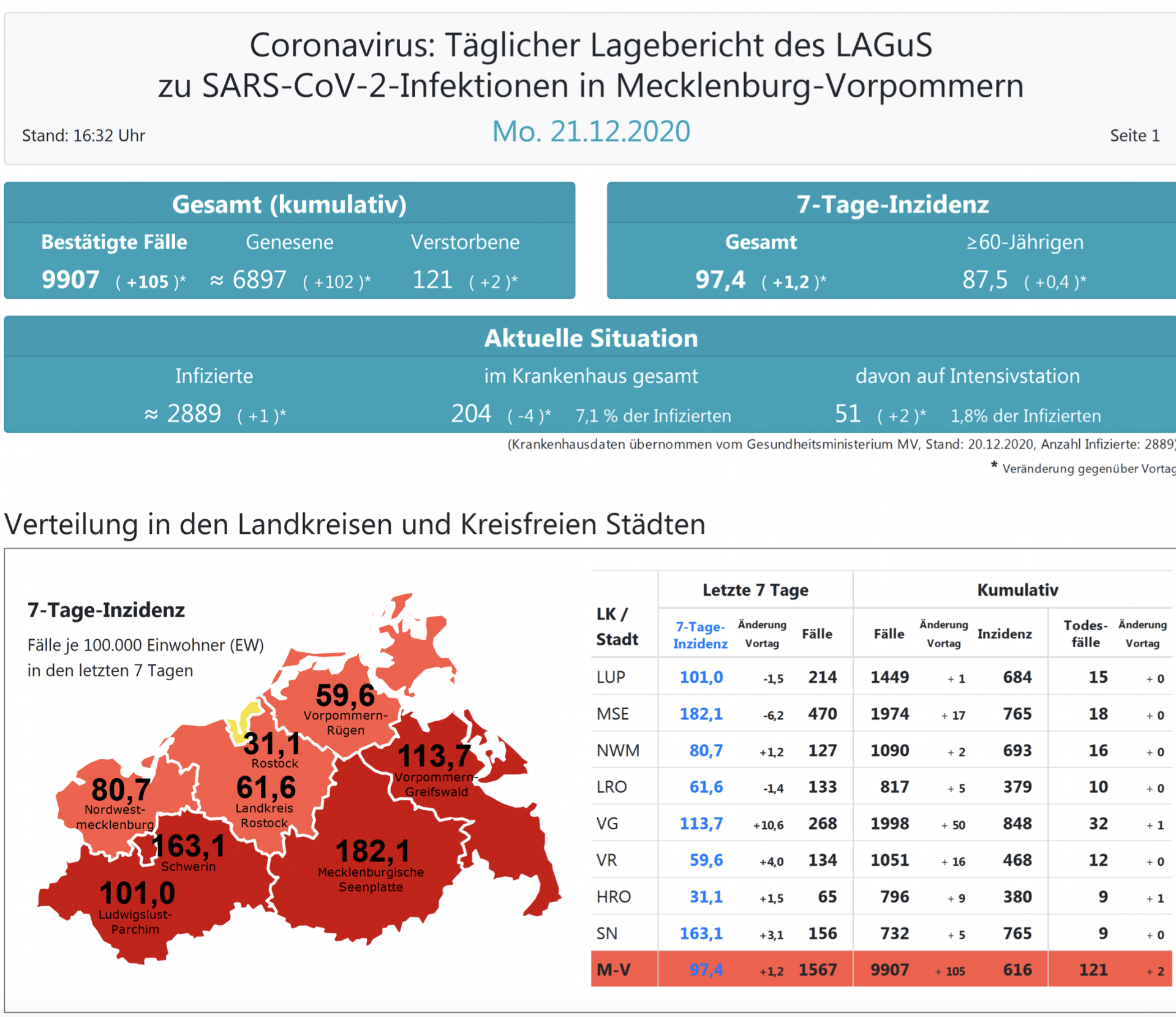 Insgesamt wurden in Mecklenburg-Vorpommern bisher 9907 Infektionen festgestellt. Im Land gab es bislang 121 Todesfälle, zwei mehr als gestern.