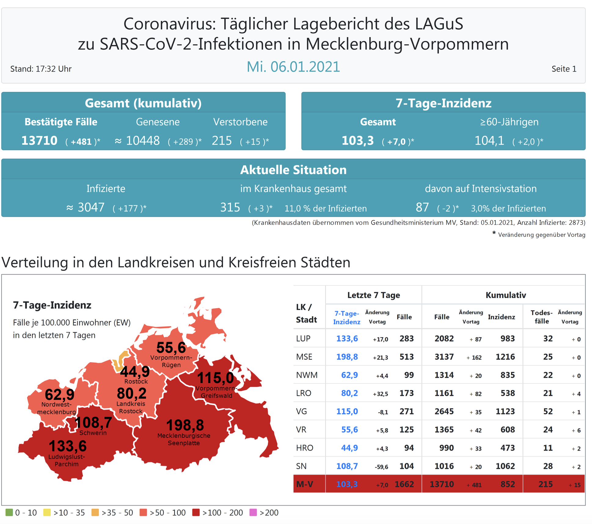 Weiterhin sehr hohe Infektionszahlen in Mecklenburg-Vorpommern, der Landkreis Mecklenburgische Seenplatte hat schon fast den Inzidenzwert von 200 erreicht: Das Landesamt für Gesundheit registriert für Mecklenburg-Vorpommern bis heute Nachmittag 481 neue Fälle. Der Landkreis Mecklenburgische Seenplatte meldet 162 Fälle und damit so viele wie noch nie und mit Abstand die meisten Neuinfektionen. Der Inzidenzwert liegt in unserem Landkreis heute bei 198,8 – den höchsten in Mecklenburg-Vorpommern. Auch in ganz Mecklenburg-Vorpommern ist dieser Wert wieder gestiegen und überschreitet jetzt 100 – heute wird er mit 103,3 angegeben.