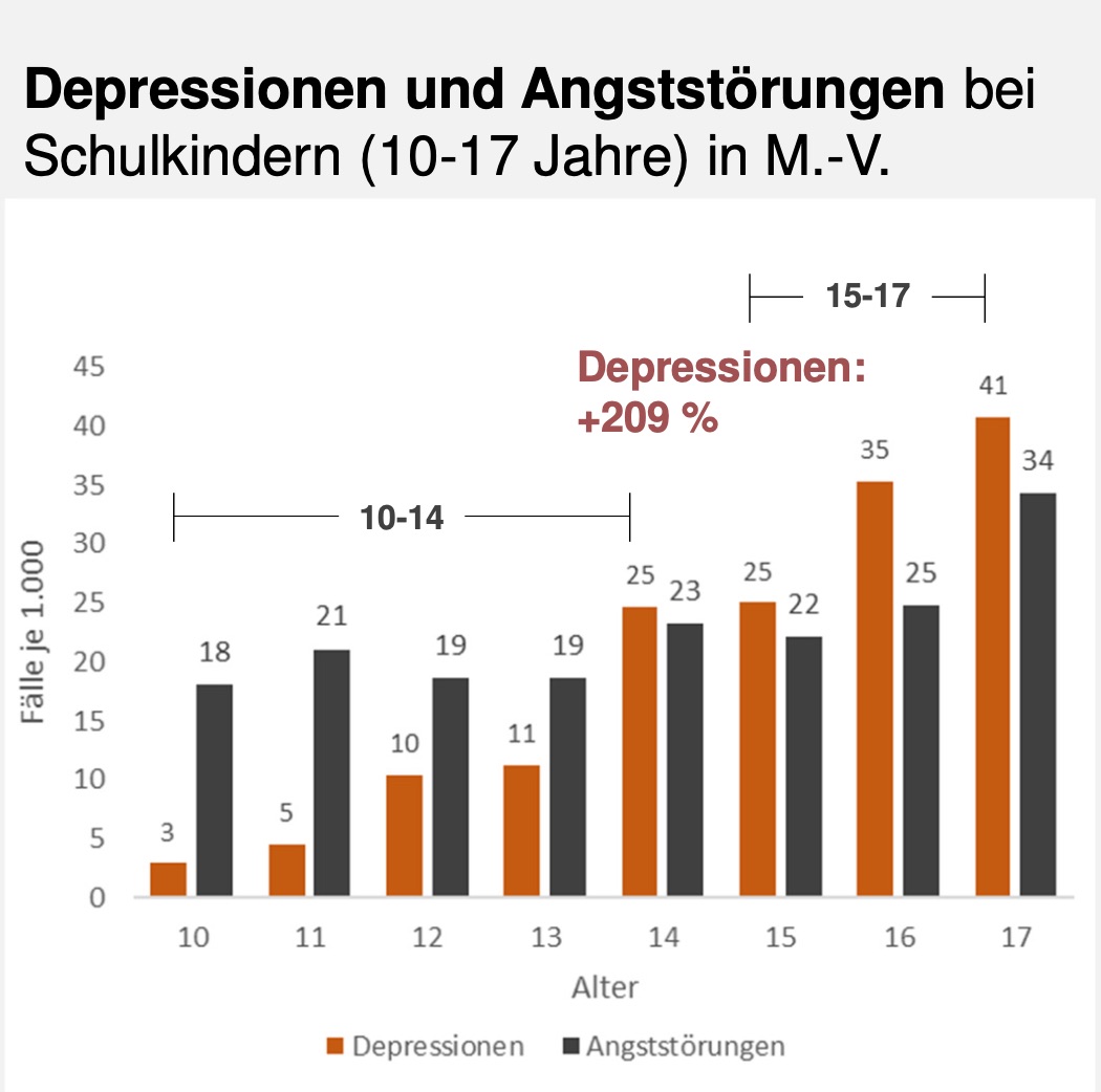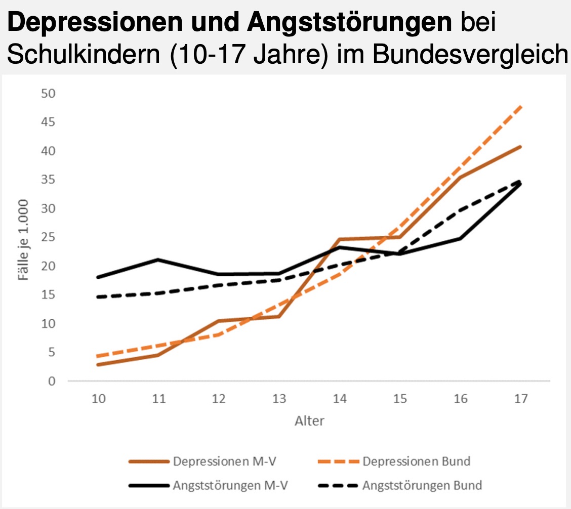 Mit einer diagnostizierten Angststörung kämpfen 2,3 Prozent aller Schulkinder. Hochgerechnet auf alle Kinder und Jugendlichen in Mecklenburg-Vorpommern entspricht dies etwa 4.200 mit Angststörungen oder Depressionen. Diese Störungsbilder treten auch parallel auf: Jeder sechste Junge mit einer diagnostizierten Depression hat parallel auch eine Angststörung. Bei den Mädchen ist es fast jedes vierte.