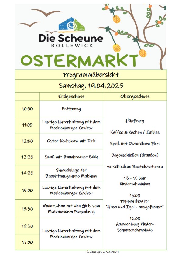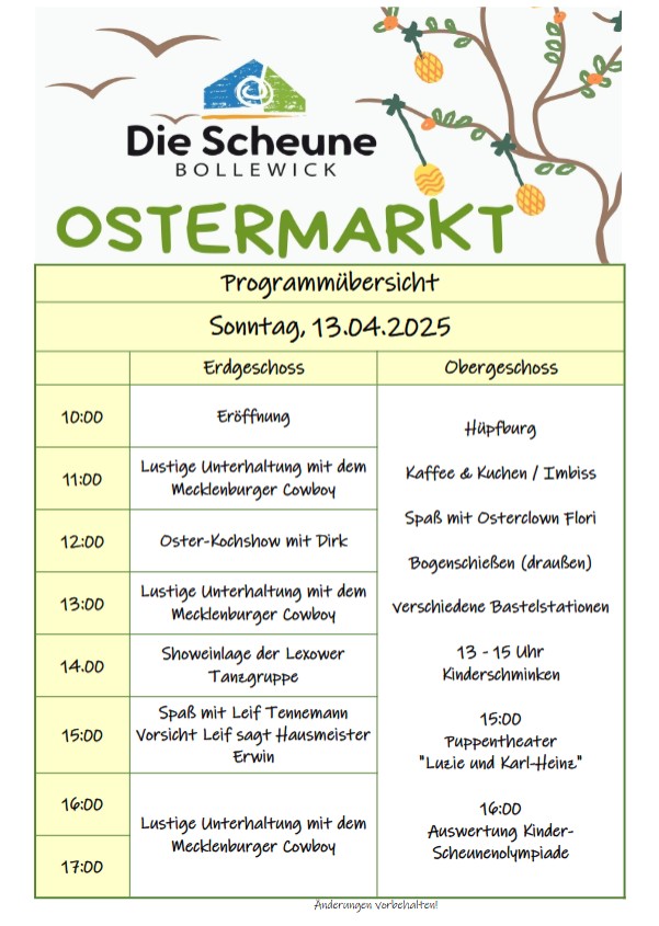 Ein Ausflug nach Bollewick lohnt sich immer – besonders aber zu Ostern, wenn der 30. Mecklenburger Ostermarkt in der großen Feldsteinscheune wieder seine Türen öffnet – mit einem farbenfrohen Angebot und abwechslungsreichen Programm für Groß und Klein. Gleich an zwei Wochenenden erklingen ganztägig beschwingte Frühlingsmelodien, die sich mit lustiger Unterhaltung auf der Bühne abwechseln. Lokale Tanzgruppen sorgen für Stimmung und legen eine kesse Sohle aufs Parkett. An österlich geschmückten Ständen werden interessante Unikate angeboten, neben handgefertigter Holzkunst, kunstvoll verzierten Ostereiern, Schmuck und Seife, auch Mode und Keramik. Nicht zu vergessen die kulinarischen Leckereien vom Wild über Fisch, Bollewicker Käse und Wredenhagener Straußenprodukten bis zu Naschereien und speziellem Likör.