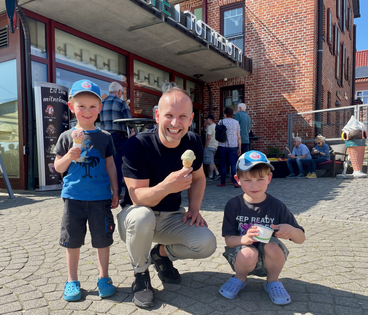 Am Warener Hafen gibt’s was zu feiern: Vlado Onufrak betreibt im alten Hafenspeicher nun schon seit 20 Jahren das Restaurant „Venezia“ und das Eiscafé „Tutti Frutti“. Er selbst ist zwar schon länger Warener, hat zunächst in der Friedensstraße gearbeitet, aber an den Hafen kam er er erst 2004. Mit seinen Angeboten hat er – da sind sich Einheimische und Urlauber einig – viel zur Belebung und Attraktivität des Warener Aushängeschildes beigetragen. Doch Vlado möchte dieses Jubiläum nicht alleine feiern, sondern gibt sozusagen einen aus. Am kommenden Dienstag, 7. Mai, erhält jedes Kind eine Kugel Eis gratis. Für die Erwachsenen gibt’s Pizza und Pasta an diesem Tag zum halben Preis. Die kleinen Hansa-Fans Anton und Hans haben mit Valdo schon mal die verschiedenen Eissorten durchprobiert und für sehr gut befunden.