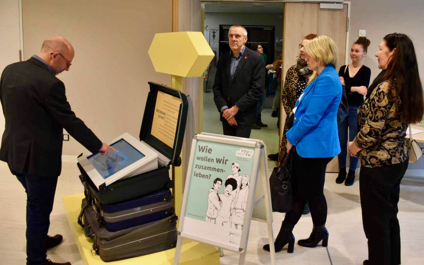 Getreu dem Ausstellungsmotto „Verstehen – Begegnen – Zusammenleben“ bietet die Ausstellung jungen Menschen, aber auch Fachkräften, Politik und der interessierten Öffentlichkeit viele Anlässe zu Begegnung und Austausch. Dazu laden sieben multimediale Stationen ein: mit Kurzfilmen, Spielen zum Mitmachen und einer Selfie-Aktion.