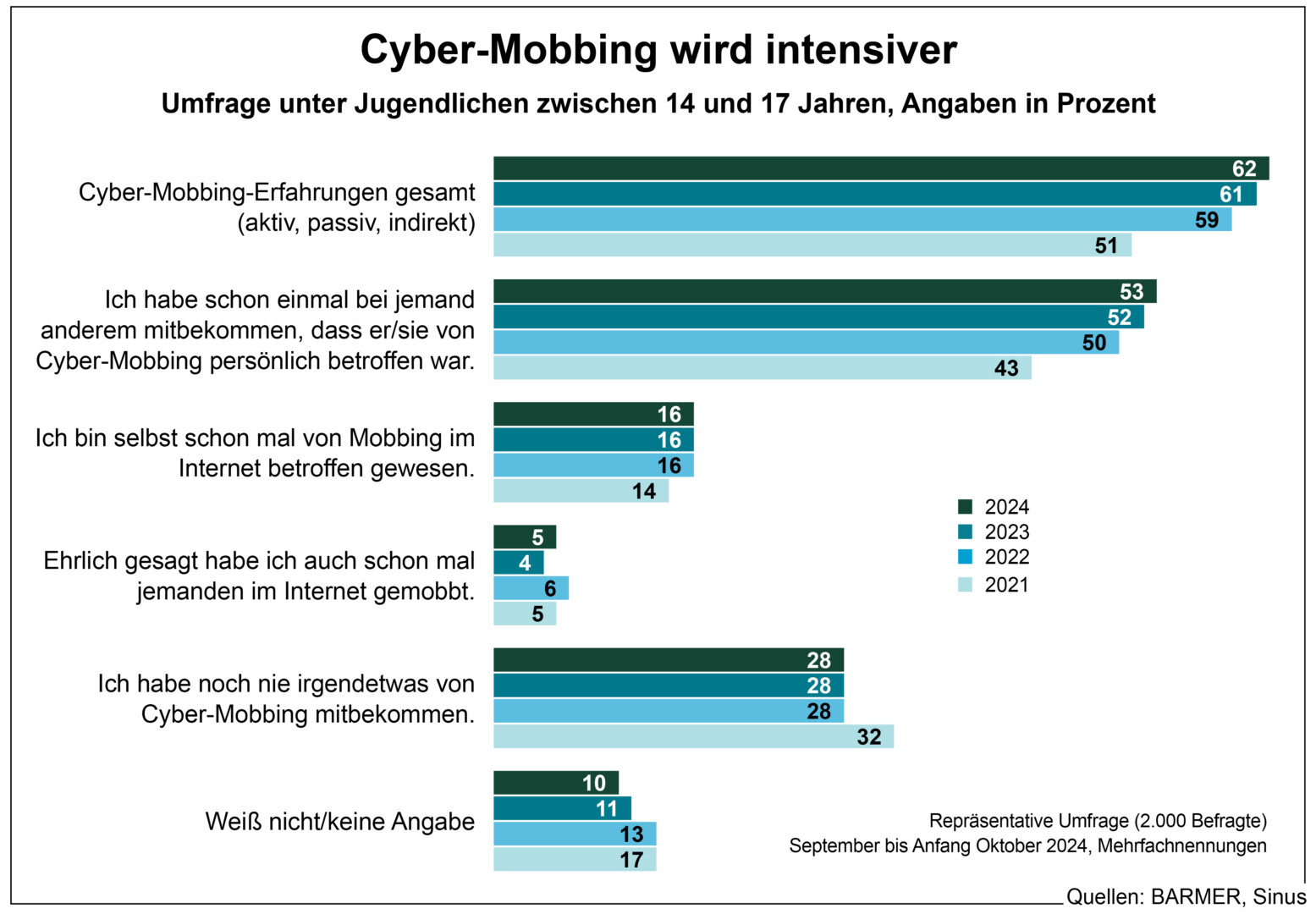 Immer mehr junge Menschen in Deutschland sind von Cyber-Mobbing betroffen. Das geht aus der repräsentativen Sinus-Jugendstudie 2024/2025 im Auftrag der Barmer hervor, für die im Herbst 2024 bundesweit rund 2.000 Jugendliche zwischen 14 und 17 Jahren befragt wurden. 16 Prozent der Befragten gaben an, selbst Opfer von Cyber-Mobbing geworden zu sein. Das ist ein Anstieg um zwei Prozentpunkte im Vergleich zum Jahr 2021. Mehr als jeder zweite Jugendliche (53 Prozent) berichtete davon, dass jemand aus seinem direkten Umfeld Ziel von Cyber-Mobbing wurde. Dieser Wert lag im Jahr 2021 noch bei 43 Prozent. „Cyber-Mobbing ist für Jugendliche eine erhebliche Gefahr, da es tiefgreifende psychische und soziale Auswirkungen haben kann. Betroffene leiden häufig unter Stress, Angst und vermindertem Selbstwertgefühl, was im schlimmsten Fall zu Depressionen oder gar Suizidgedanken führen kann“, sagt Prof. Dr. med. Christoph Straub, Vorstandsvorsitzender der Barmer. Auch könnten ständige Belästigungen in sozialen Medien schulische Leistungen beeinträchtigen und zu sozialer Isolation führen.