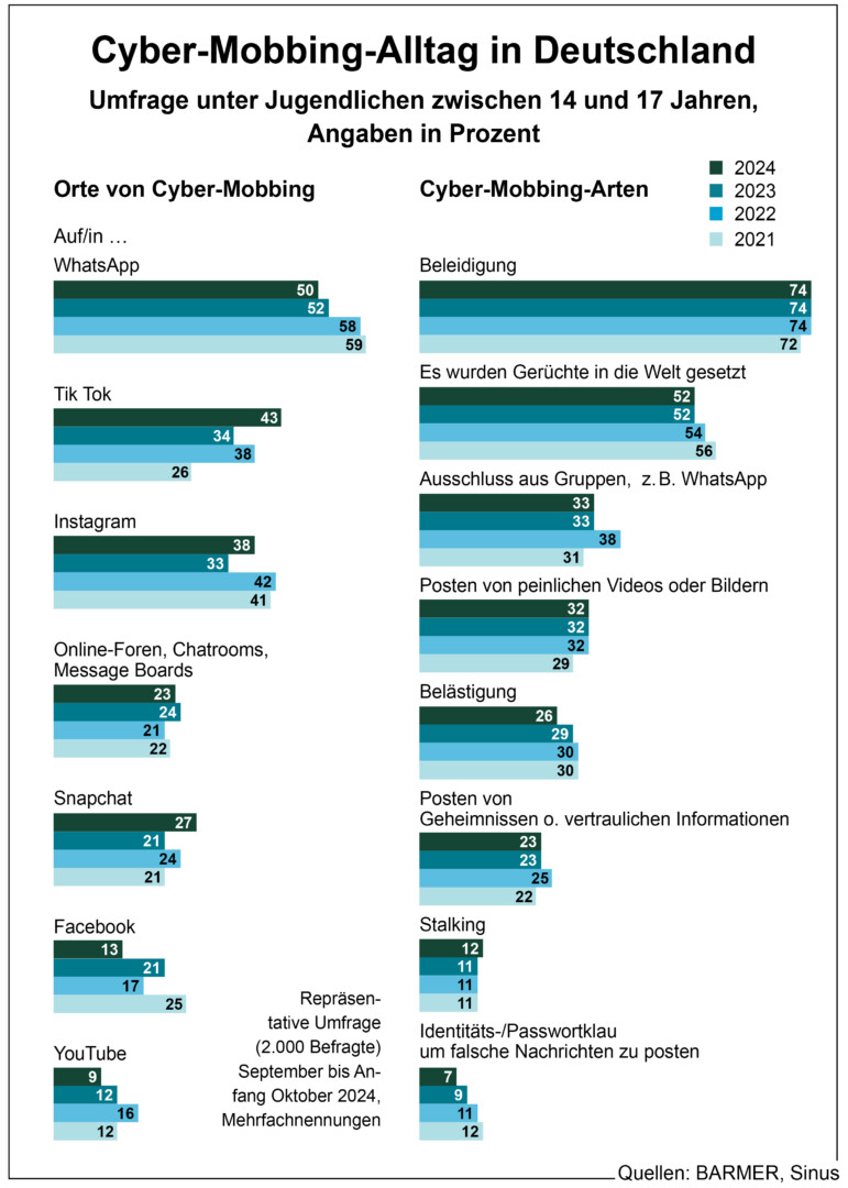 Die Sinus-Jugendstudie liefert zudem detaillierte Einblicke in Formen und Kanäle, über die Cyber-Mobbing stattfindet. Messenger-Dienste wie WhatsApp wurden mit 50 Prozent am häufigsten genannt, gefolgt von Plattformen wie TikTok und Instagram mit 43 beziehungsweise 38 Prozent. Die häufigsten Formen von Cyber-Mobbing umfassen Beleidigungen mit 74 Prozent, das Verbreiten von Gerüchten sowie den Ausschluss aus Gruppen. „Besonders belastend ist das Hochladen und Teilen als peinlich empfundener Bilder und Videos. Die permanente Verfügbarkeit sozialer Medien macht es schwierig, Mobbing zu entkommen, was Druck und Belastung noch verstärkt“, sagt Barmer-Chef Straub.