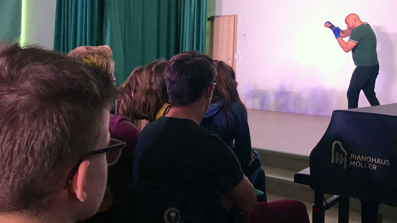 Was wollt ihr? …schallt die Frage durch die Aula. Schon mal drüber nachgedacht, was ihr wollt? Doch die Zehntklässler des Warener Wossidlo-Gymnasiums antworten nicht. Er stellt die Frage noch mal, nur lauter – viel lauter. Wie ein Donnern erfüllt sie die Bühne. Keiner der Schüler wagt es, zu reden. Rausgerissen aus ihrem Schulalltag befinden sie sich plötzlich in einer anderen Welt. Oder vielleicht doch nicht? „Fighter“ heißt die mobile Jugendtheater-Produktion. Es spielt: Peer Roggendorf vom COMPAGNIE de COMÉDIE aus Rostock.