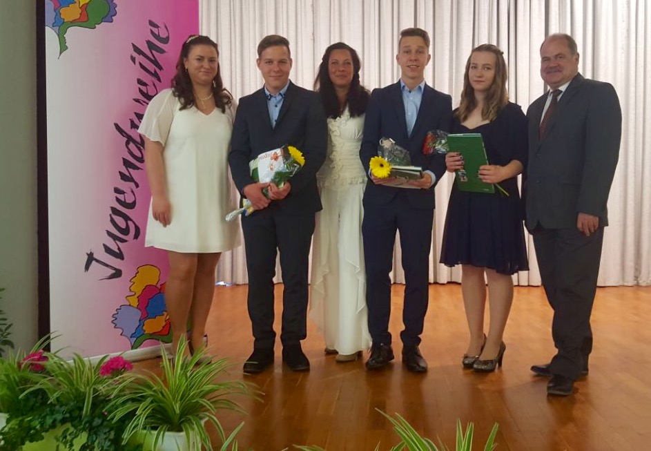 Auf dem Foto: Die Drillinge Tom, Paul und Hanna Reinke mit der Jugendweihe-Verantwortlichen Carina Goetz in der Mitte, Festredner Peter Ritter sowie Helferin Sophie Borchert.
