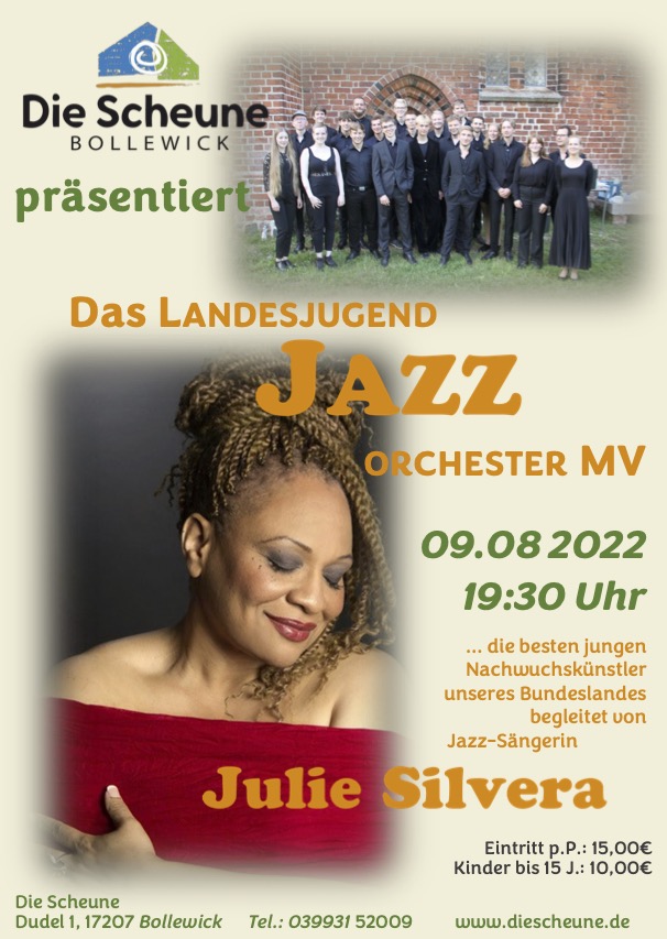 In der Scheune Scheune Bollewick ist am morgigen Dienstag, 9. August, ab 19.30 Uhr das LandesjugendJazzOrchester mit der Jazz-Sängerin Julie Silvera zu Gast. Das LaJazzO MV bietet den besten jungen Nachwuchskünstlern Mecklenburg-Vorpommerns im Alter zwischen 14 und 24 Jahren eine Plattform des gemeinsamen Musizierens in einer Auswahl-Big-Band.