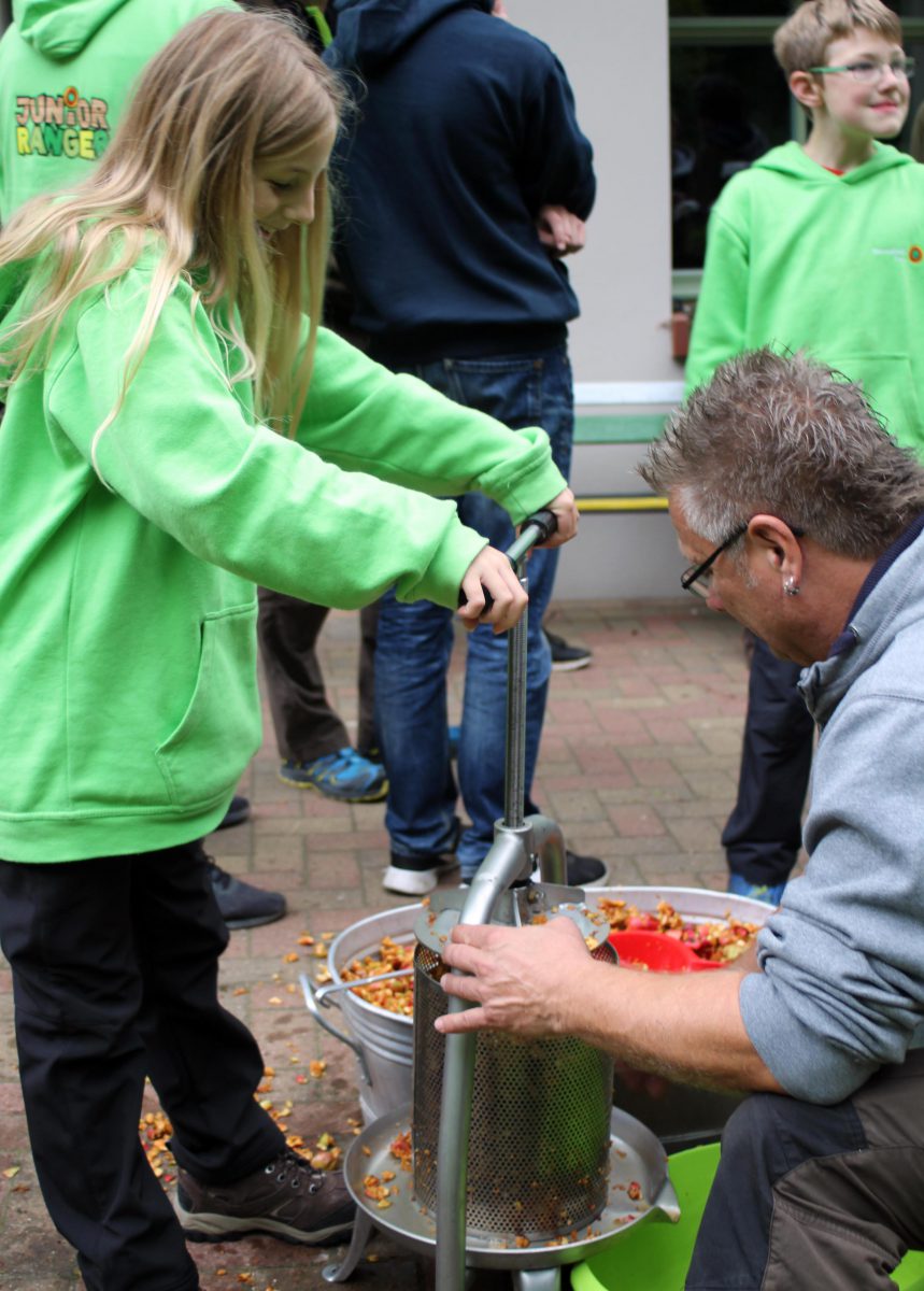 Bild im Text: Apfelpressen per Hand – für die meisten Gäste aus dem Nationalpark Harz und UNESCO-Biosphärenreservat Schorfheide-Chorin ein ganz neues Erlebnis