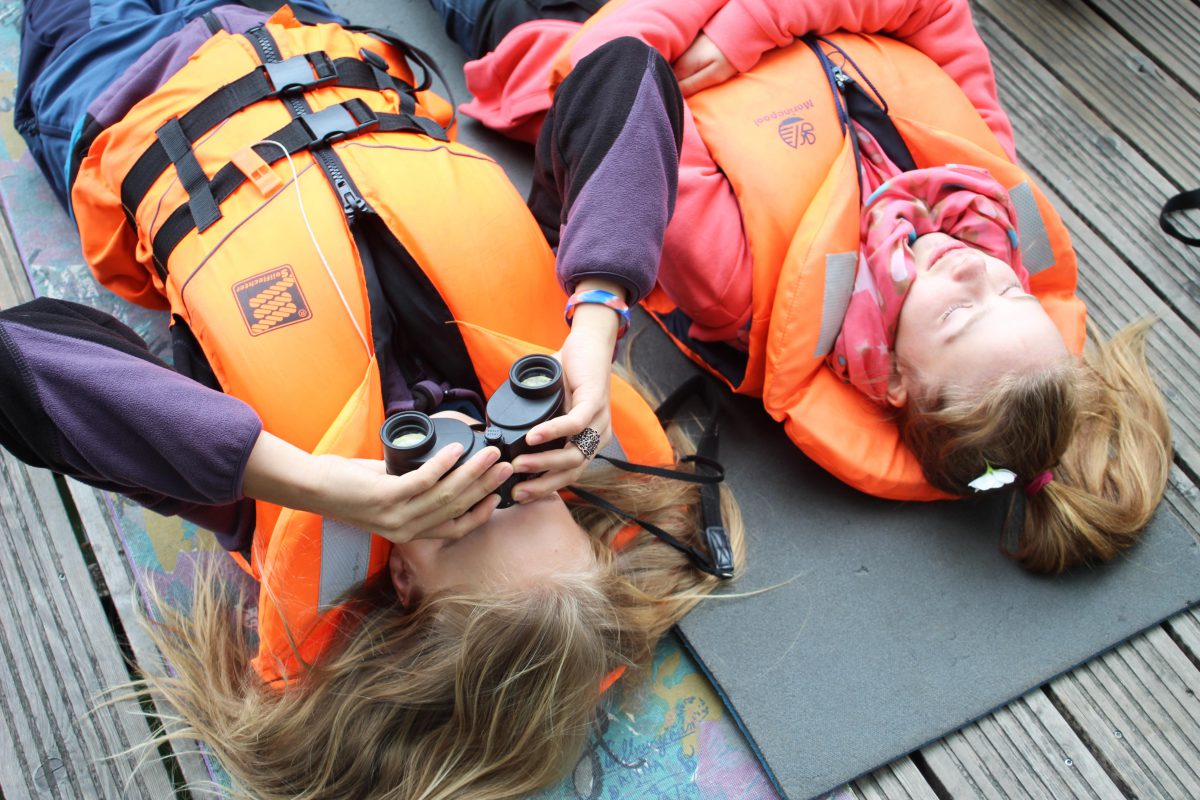 Bild oben: Welcher Vogel fliegt denn da – Beobachtung auf der Floßtour über den Grünower See (Foto: Ulrike Schade, Nationalparkamt Müritz)