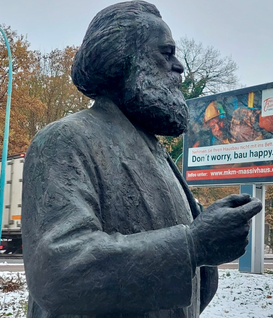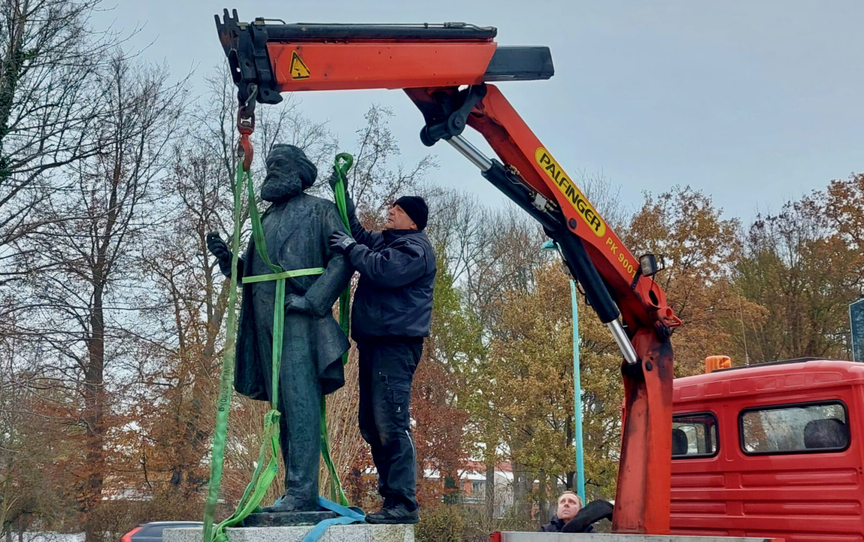 „Die Figur mit dem dicken Stein, auf dem sie befestigt ist, wiegt 1,8 Tonnen“, sagte Meißner. Davon entfallen nur 350 Kilogramm auf die 2,20 Meter hohe Marx-Figur. Die Statue hatte der Berliner Bildhauer Gerhard Thieme (1928-2018) im Jahr 1969 für Neubrandenburg und die DDR-Führung geschaffen. Dort stand sie lange auf dem Markt, dann an der Bibliothek im Zentrum und seit 2018 und nach kontroversen Debatte nun in den Park.