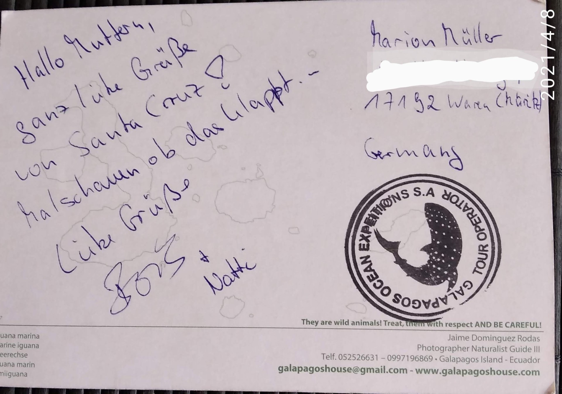 Gebracht hat die Karte ein junger Mann, der offenbar auch auf den Galapagosinseln war. „Zuerst dachten wir, es ist ein Briefzusteller, dann fiel uns auf, dass auf der Karte gar keine Briefmarke klebt“, erzählt Marion Müller. Absender waren ihr Sohn und die Schwiegertochter. Und die besuchten die Insel schon vor einem Jahr. Also rief die Warenerin ihren Sohn an, und der war gleich ganz begeistert und konnte aufklären: