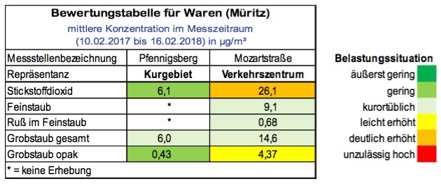 Die Überprüfung der Luft in Waren ergab laut Gutachten, das WsM vorliegt, dass die Luftqualität für alle untersuchten Luftbeimengungen in Waren meist gut ausgefallen ist. Sogar an der Mess-Stelle „Mozartstraße“ liegt die Belastung meist im normalen und kurortüblichen Bereich. Bei Grobstaub ist dort die Belastung leicht erhöht, bei Stickstoffdioxid sogar deutlich erhöht. Aber diese Erhöhungen lagen alle im gesetzlich vorgeschriebenen Rahmen, um die Titel weiter tragen zu dürfen. Die Erhöhung gab es vor allem in der Zeit, in der der Winterdienst unterwegs war.