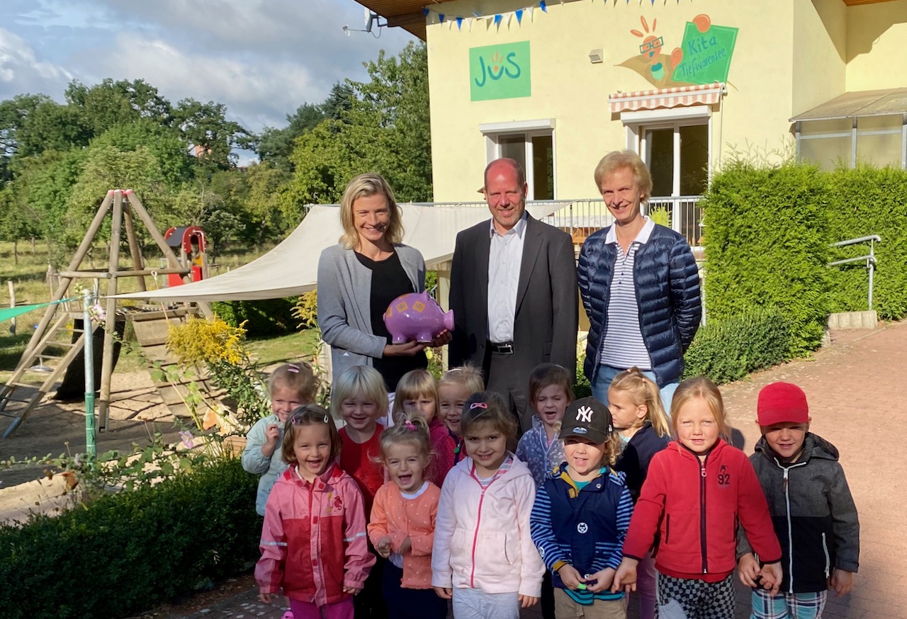 428 Euro überreichten Wogewa-Prokuristin Kristin Görlach und Ben Ansorge von der CineStar-Gruppe gestern, und die kleinen der Igel-Gruppe hatten auch schon ein, zwei Ideen, wie sie das Geld anlegen wollen: „Pommes kaufen. Und Eis“, verkündeten sie. Natürlich bekommen sie auch ein Eis, wie Kita-Chefin Christine Lebzien verriet, aber das meiste Geld wird genutzt, um Spielsachen für die Kinder zu kaufen.