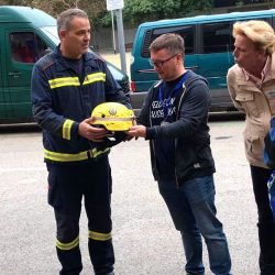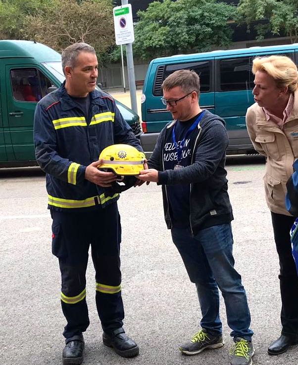 Montag ging’s dann früh wieder los – Ziel war die Feuerwehr Barcelonas die „Bombers”. Mithilfe einer Dolmetscherin waren die Sprachbarrieren kein Problem. Die Einsatzkräfte nahmen sich viel Zeit für die Gäste, zeigten ihren Fuhrpark und führten eine Löschübung vor. Zum Abschluss überreichten THW und Feuerwehr noch jeweils einen Helm als Gastgeschenk. Anschließend ging es dann zum Katastrophenschutzzentrum des Innenministerium. Mit ein wenig Sightseeing und oder Entspannung am Pool endete der erste Tag.