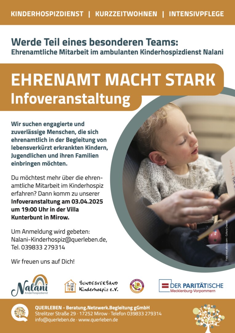 Interesse geweckt? Alle, die sich für dieses besondere Ehrenamt interessieren, sind herzlich eingeladen, sich unverbindlich zu informieren. Eine Anmeldung zum Infoabend ist unter Nalani-Kinderhospiz@querleben.de oder unter 039833 – 279314 erwünscht.