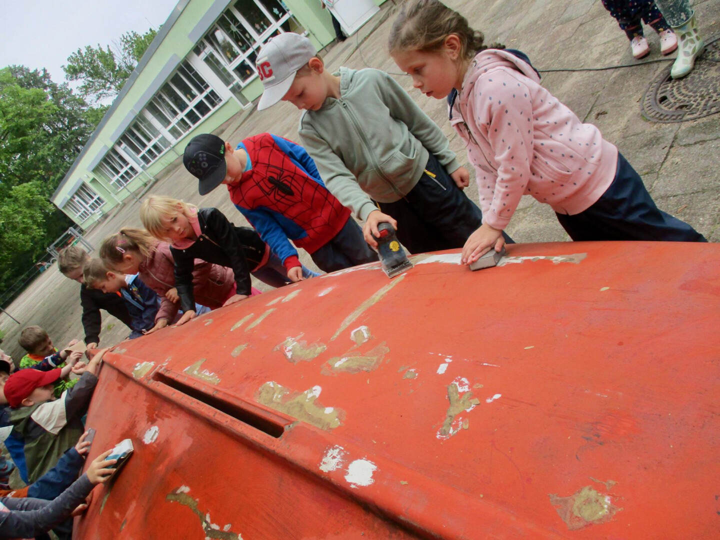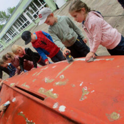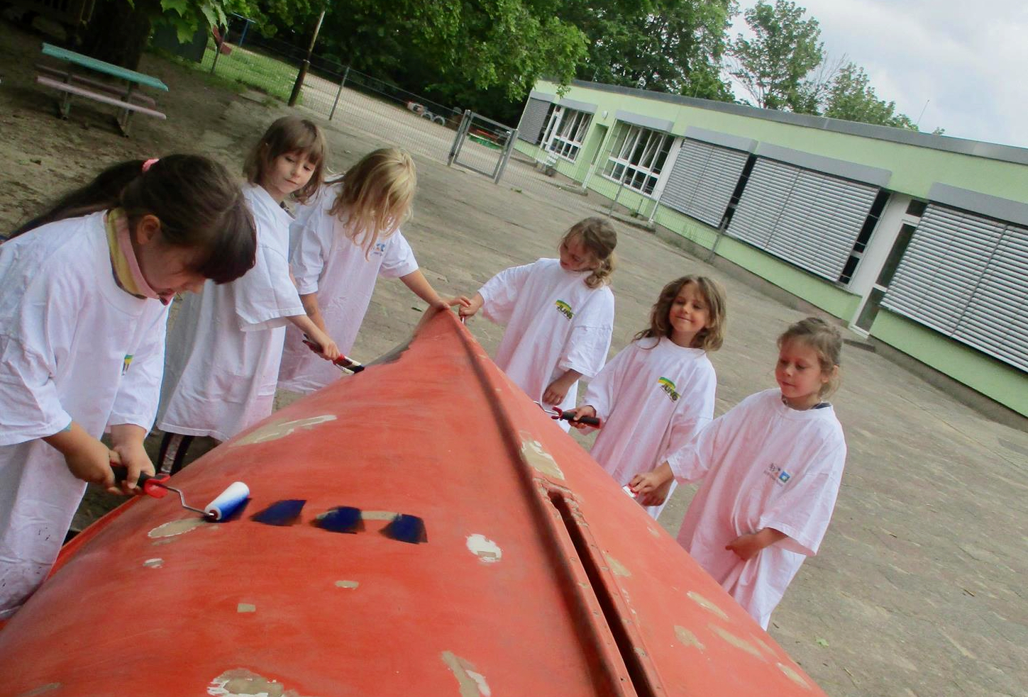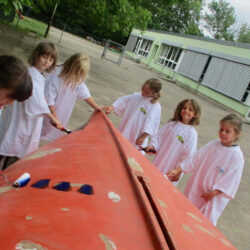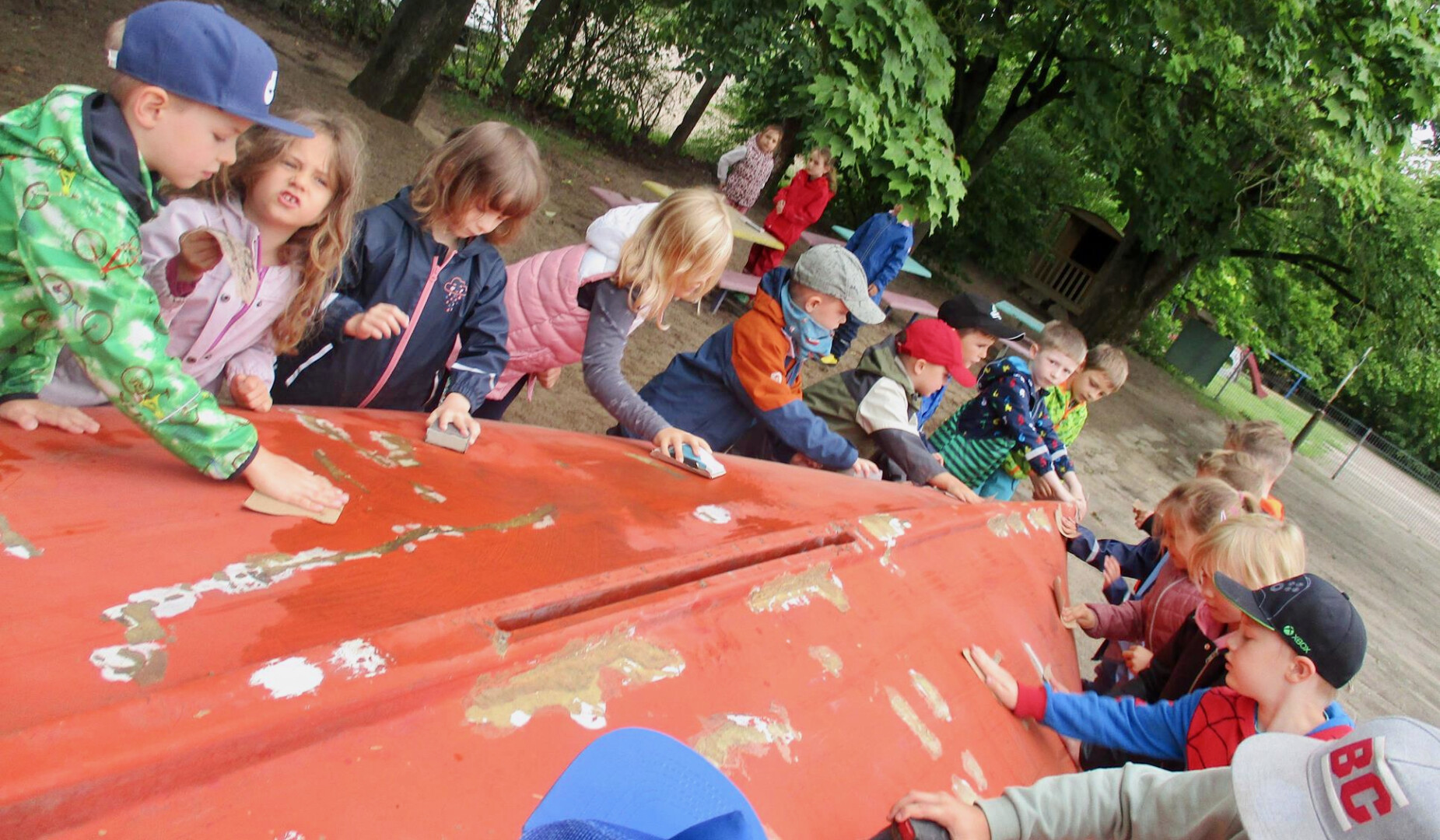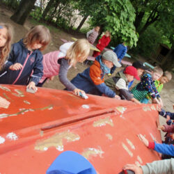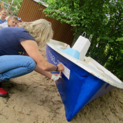 Von einer Spende des OBI-Baumarktes wurden Pinsel, Rollen, Farbe und Schleifpapier gekauft. Dann begann das Schleifen, das Streichen und das Buddeln, denn das Boot muss ja fest stehen. Alle Kinder halfen fleißig mit und hatten viel Spaß dabei. Was so kleine Hände schon alles können.