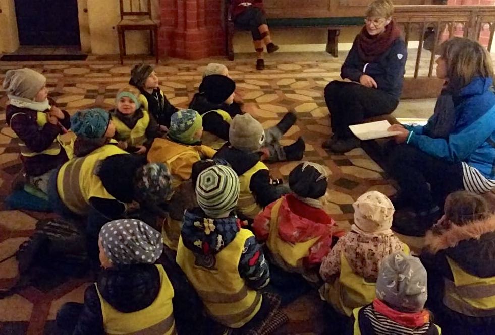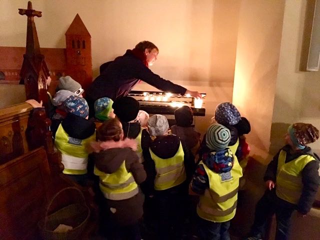 Dort ließen sich die Kinder bei einem Rundgang die Kirche bei Nacht und ihre vielen, kleinen Ecken zeigen. Die Gemeindepädagogin der Georgenkirche erzählte den Kinder von St. Martin und lud sie zum gemeinsamen Singen ein.
