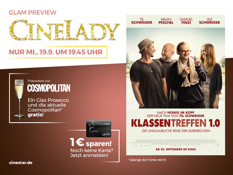 Der Kauf einer Karte beinhaltet den Film, ein Glas Prosecco auf Kosten des Hauses und eine Cosmopolitan (solange der Vorrat reicht). Mit der CineStar Card ist eine Ersparnis von 1€ pro Karte möglich.