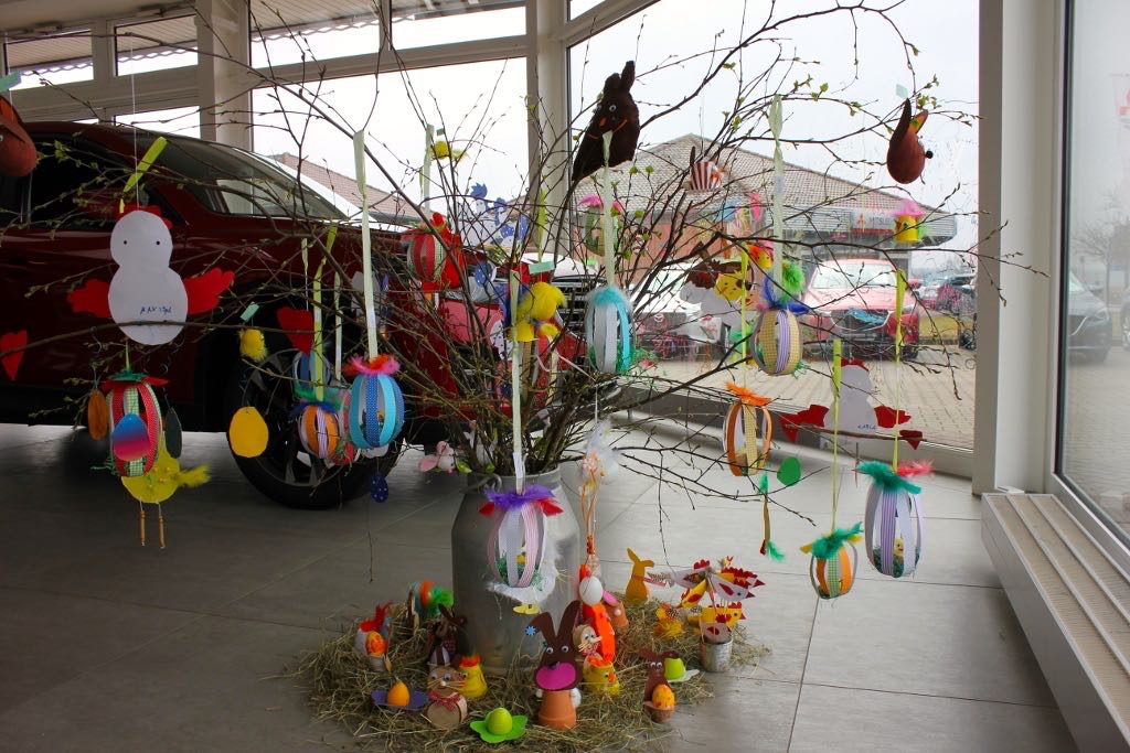 Die Osterbasteleien können bis zum 18. April im Autohaus gegen einen kleinen Obolus erstanden werden. Sicherlich nicht nur interessant für die Eltern und Familienmitglieder der kleinen Künstler.