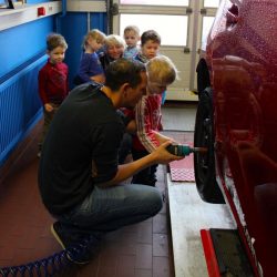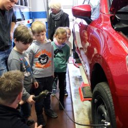 „Die Kinder durften nicht nur zusehen, sondern auch selbst helfen, versuchten beispielsweise, einen abmontierten Reifen hochzuheben, probierten die Hebebühne aus und überprüften unter fachkundiger Anleitung den Reifendruck“, so Doreen Kaschmieder.