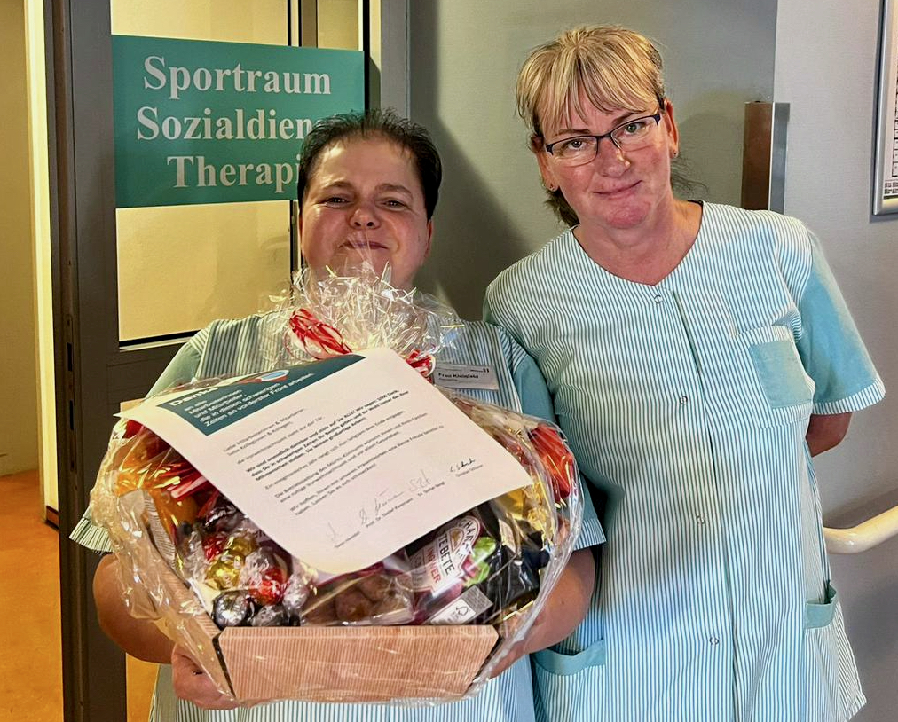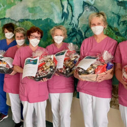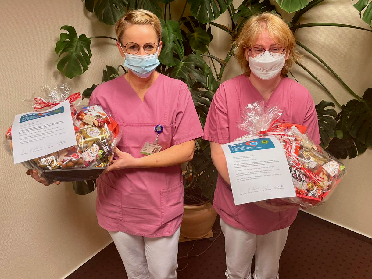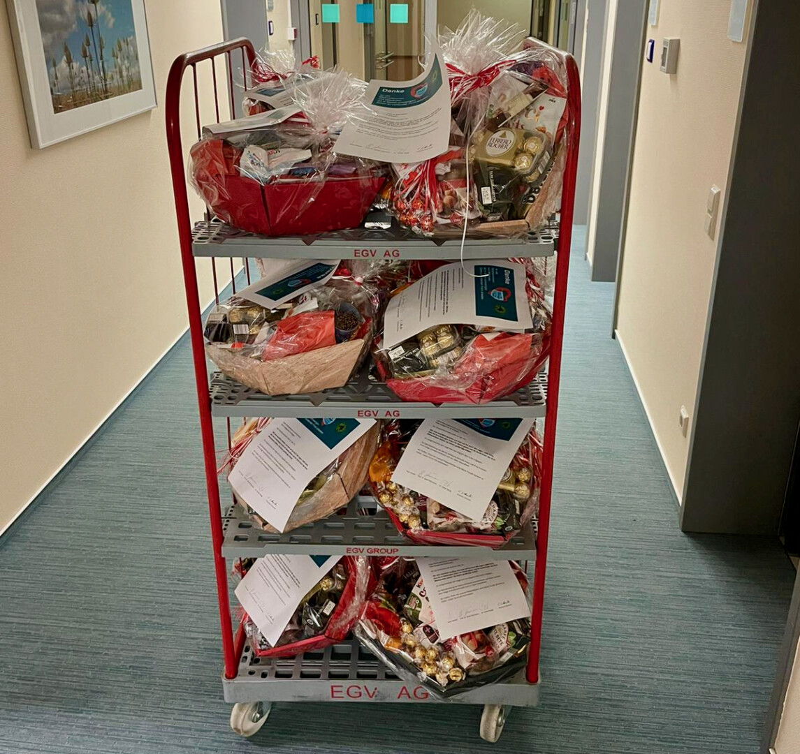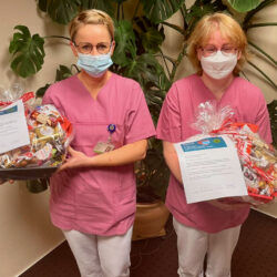 Es ist eine kleine Aufmerksamkeit, die aber eine große Wertschätzung zum Ausdruck bringen soll: Die Geschäftsführung des MediClin Müritz-Klinikums hat in dieser Woche jede Menge prall gefüllte Präsentkörbe verteilt. Pflegedirektor Christian Schuster und Maxi Kuhse, Bereichsleitung Psychiatrie, brachten die Körbe zu den Mitarbeitern in allen Bereichen. Dazu gab’s ein kleines Anschreiben, in dem es unter anderem heißt: „“Wir sind unendlich dankbar und stolz auf Sie ALLE! Wir sagen: 1000 Dank, dass Sie in schwierigen Zeiten Ihr Bestes geben und Ihr Wohl hinter das Ihrer Mitmenschen stellen. Sie leisten großartige Arbeit!“