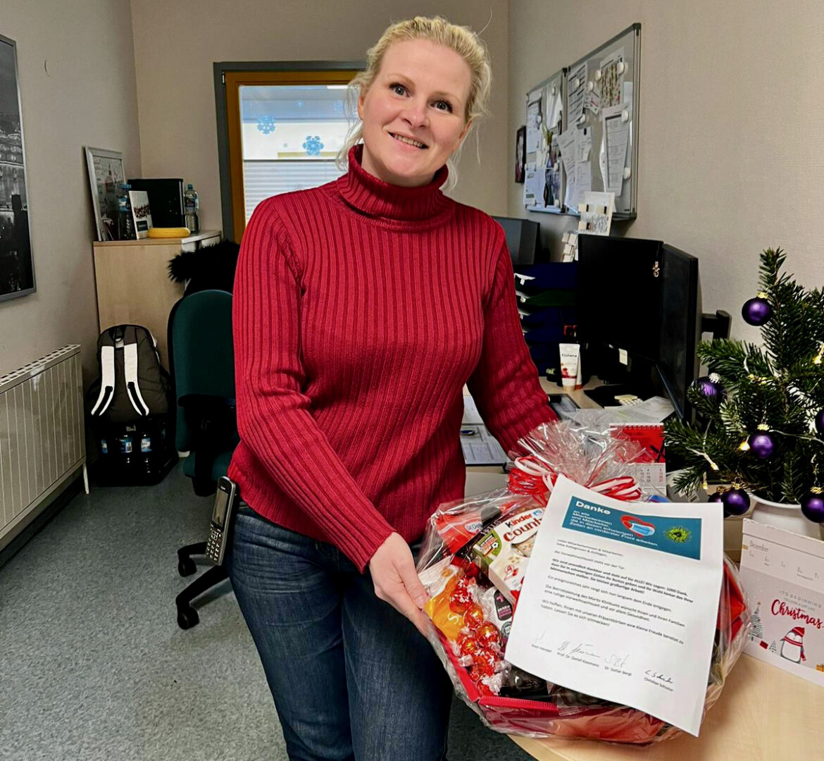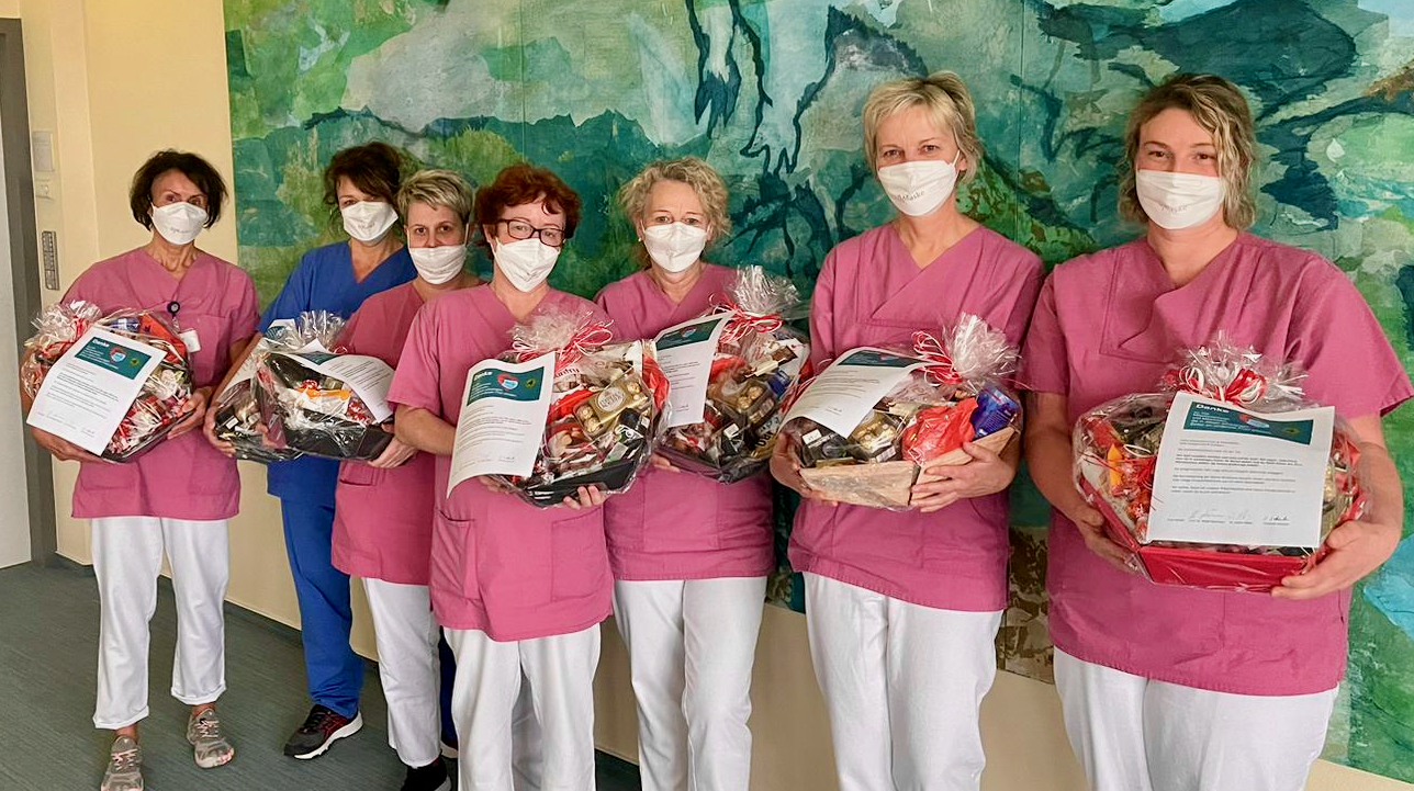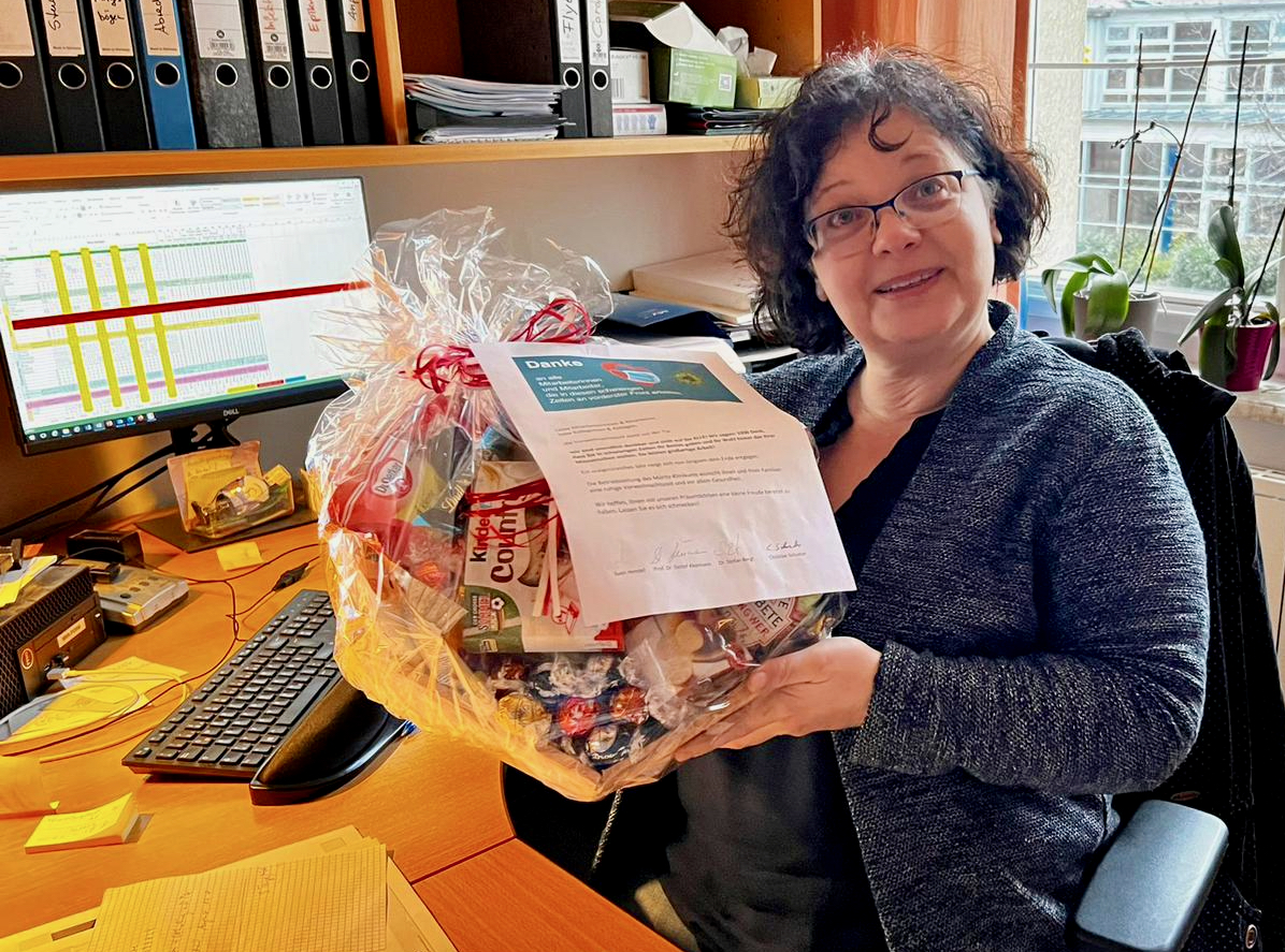 Es ist eine kleine Aufmerksamkeit, die aber eine große Wertschätzung zum Ausdruck bringen soll: Die Geschäftsführung des MediClin Müritz-Klinikums hat in dieser Woche jede Menge prall gefüllte Präsentkörbe verteilt. Pflegedirektor Christian Schuster und Maxi Kuhse, Bereichsleitung Psychiatrie, brachten die Körbe zu den Mitarbeitern in allen Bereichen. Dazu gab’s ein kleines Anschreiben, in dem es unter anderem heißt: „“Wir sind unendlich dankbar und stolz auf Sie ALLE! Wir sagen: 1000 Dank, dass Sie in schwierigen Zeiten Ihr Bestes geben und Ihr Wohl hinter das Ihrer Mitmenschen stellen. Sie leisten großartige Arbeit!“