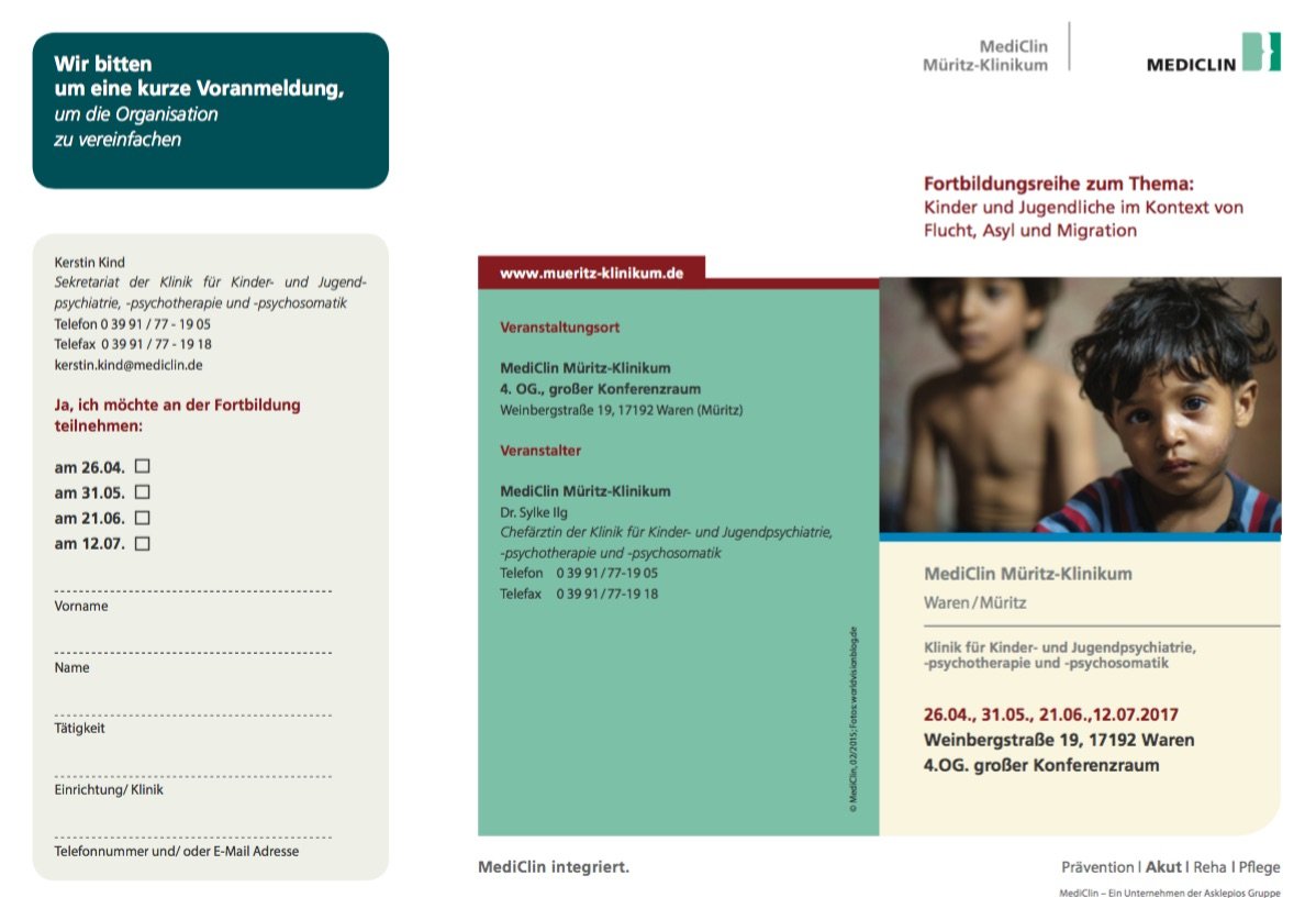 Die Kinder- und Jugendpsychiatrie des MediClin Müritz-Klinikums in Röbel hat eine öffentliche Fortbildungsreihe ins Leben gerufen, die sich mit Kindern und Jugendlichen aus geflüchteten Familien beschäftigt. Denn auch in den Kliniken und Praxen der Region müssen immer häufiger Kinder und Jugendliche behandelt werden, die als Flüchtlinge, Asylbewerber oder Migranten in der Region leben. Am morgigen Mittwoch geht es ab 17 Uhr im Versammlungsraum des Müritz-Klinikums um das Thema „Seelische Reaktionen auf Krieg und Flucht im Kindes- und Jugendalter. Die Fortbildung ist öffentlich, kann also auch gerne von Interessenten besucht werden.
