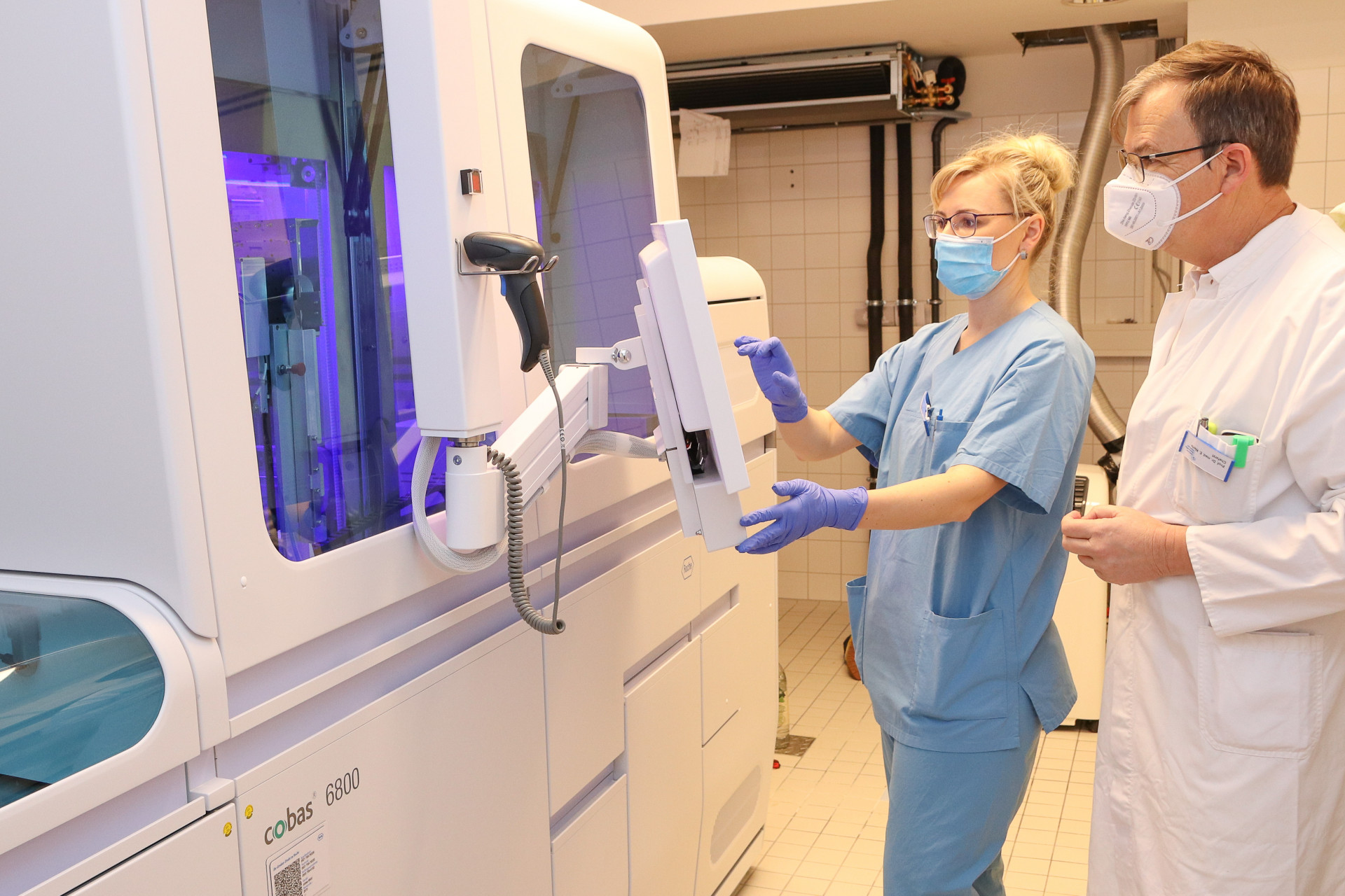 Foto: Diplombiologin Eleonora Wasmund hat sich bereits eingehend mit dem neuen Gerät vertraut gemacht und erklärt Laborchef Prof. Dr. med. Egon Werle einige Funktionalitäten.
