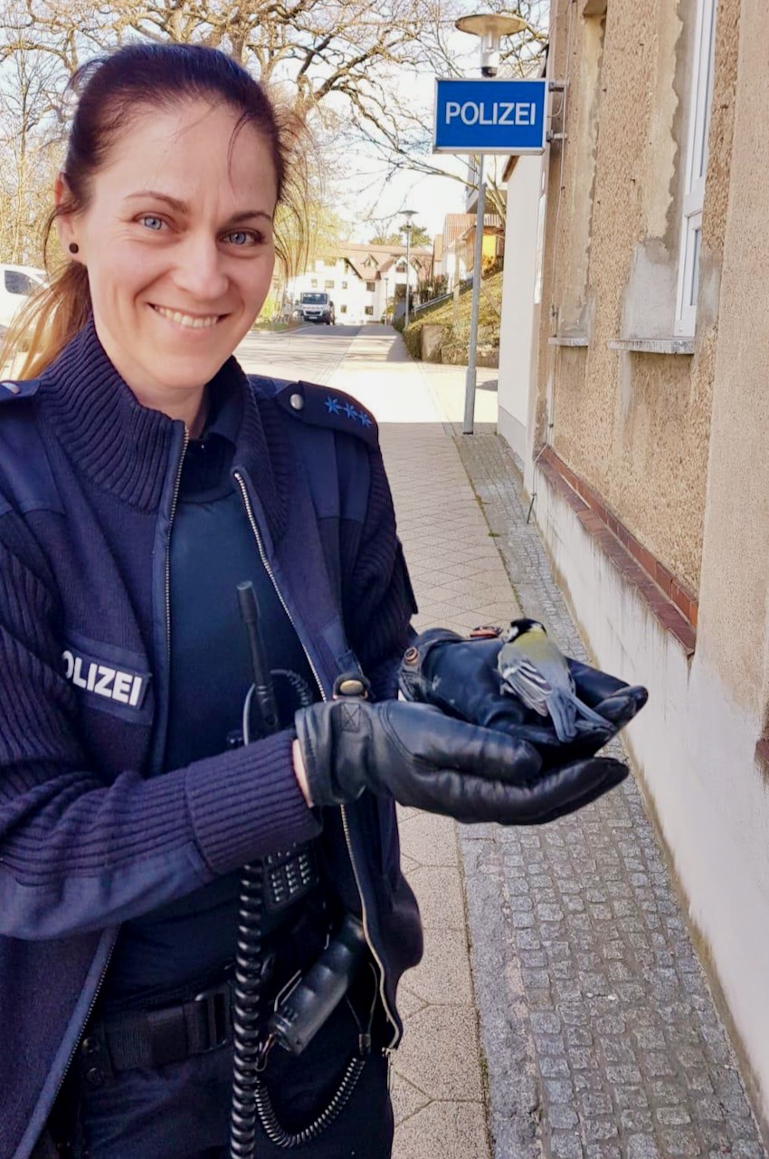 Polizistin Anne hat sie gefunden und ins Gebüsch gesetzt. Der Meise ging es dann auch gleich wieder besser.