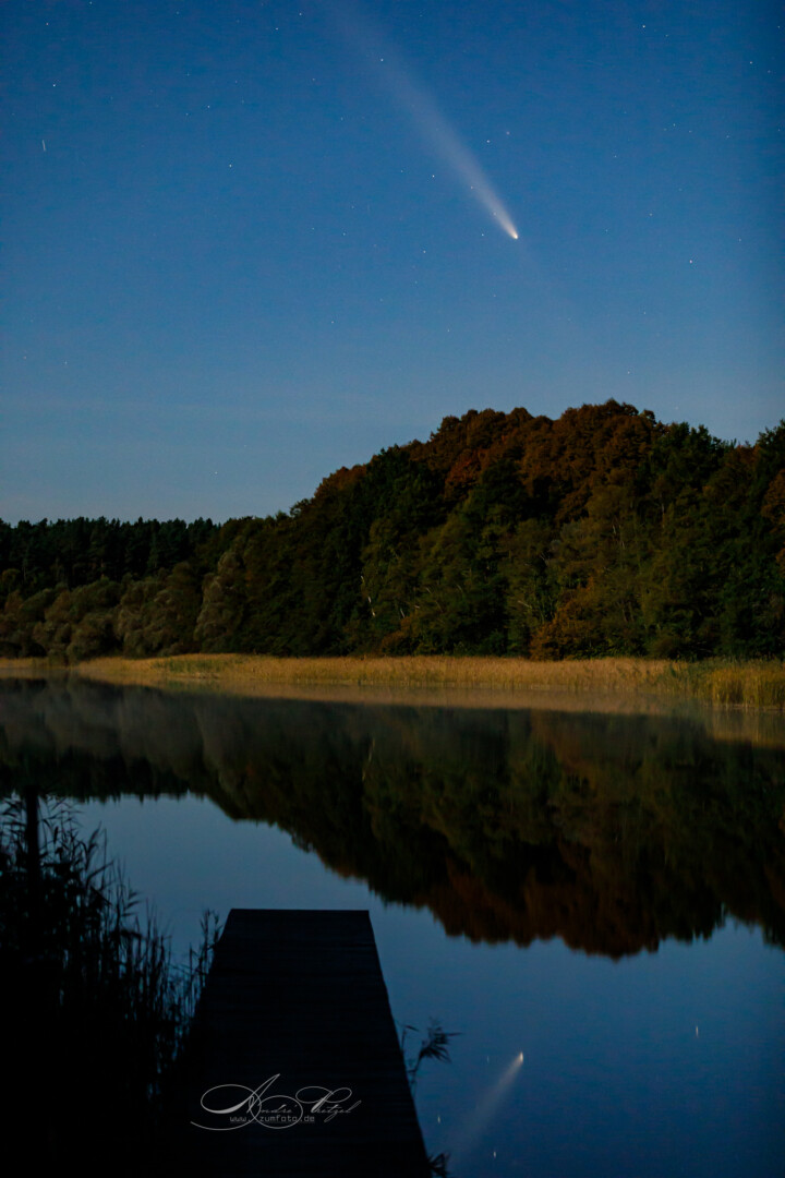 Hier ein Bild des Warener Fotografen André Pretzel – mit doppeltem Kometen, einmal am Himmel, einmal als Spiegelung auf dem Wasser.