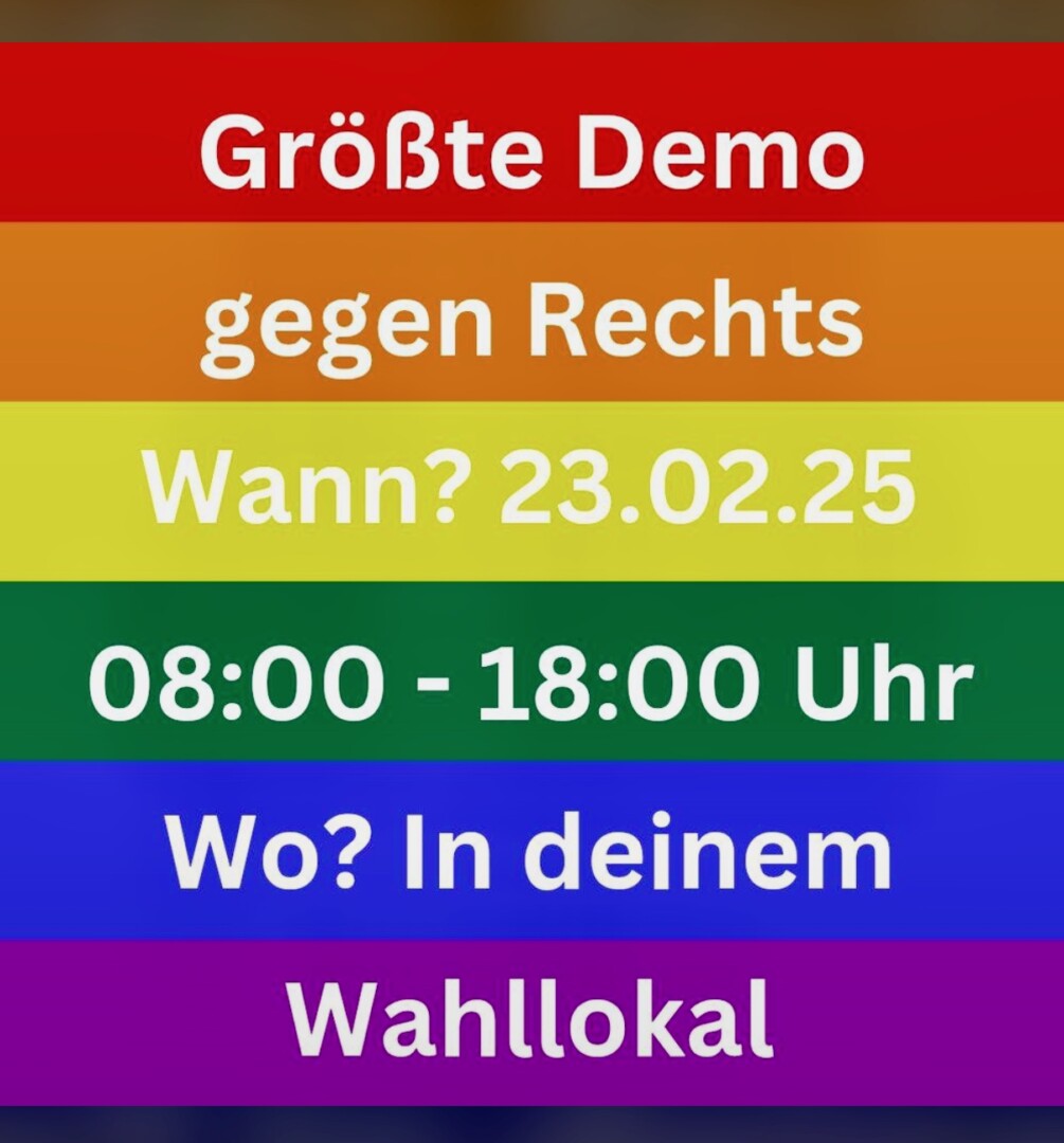 Und in diesem Kontext ist es derzeit geradezu grotesk und lächerlich, dass vor allem Freunde der Linkspartei, der Grünen und der SPD einen Post (Foto) durch die Facebook- und WhatsApp-Welt schicken, in dem es vor den bekannten Regenbogen-Farben heißt: „Größte Demo gegen Rechts am 23. Februar in Deinem Wahllokal.“ Gerade diejenigen, die für sich in Anspruch nehmen, sich dafür einzusetzen, dass unsere Gesellschaft nicht weiter gespalten wird, tun alles dafür, dass der Spalt immer größer wird.
