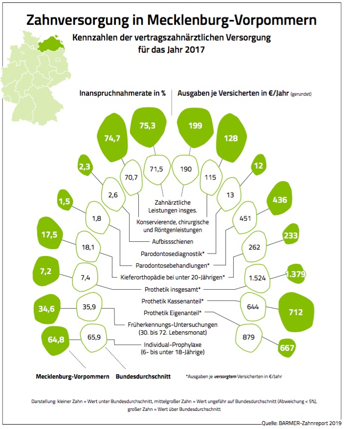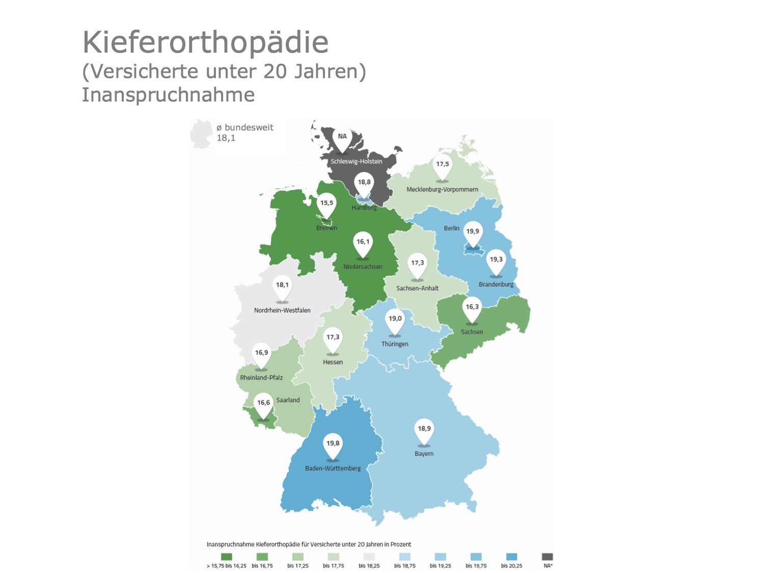 Der BARMER-Zahngesundheitsatlas zeigt zudem deutliche Unterschiede zwischen Stadt und Land. So bekamen 9,0 Prozent der Berliner und 8,7 Prozent der Hamburger im Jahr 2017 einen neuen Zahnersatz. Im Saarland waren es lediglich 6,4 Prozent und in Bayern und Rheinland-Pfalz jeweils 6,9 Prozent. Bundesweit traf dies auf 7,4 Prozent zu. „Dass vor allem die Versicherten in den Stadtstaaten häufiger Zahnersatz bekommen, könnte zum einen am leichteren Zugang zur Versorgung bei einer vergleichsweise hohen Zahnarztdichte liegen. Zum anderen könnten höhere ästhetische Ansprüche eine Erklärung sein“, sagte Walter. Bei der Kieferorthopädie zeigt der Altas, dass die Inanspruchnahme bei den unter 20-Jährigen in Flächenländern etwas geringer ausfällt als im Bundesdurchschnitt. Dies könne unter anderem an den räumlich weiteren Wegen zum Kieferorthopäden liegen. Besonders bei den sogenannten Zahnschienen zeigt sich eine deutliche Diskrepanz zwischen Stadt und Land. Je 3,7 Prozent der Hamburger und der Berliner brauchen eine solche Hilfe bei Beschwerden im Kieferbereich, zum Beispiel durch Zähneknirschen. Zum Vergleich, in Thüringen sind es nur 1,4 Prozent. „Der vergleichsweise stressige Alltag in Großstädten könnte ein Grund für die höhere Zahl von Aufbissschienen sein“, so Walter.