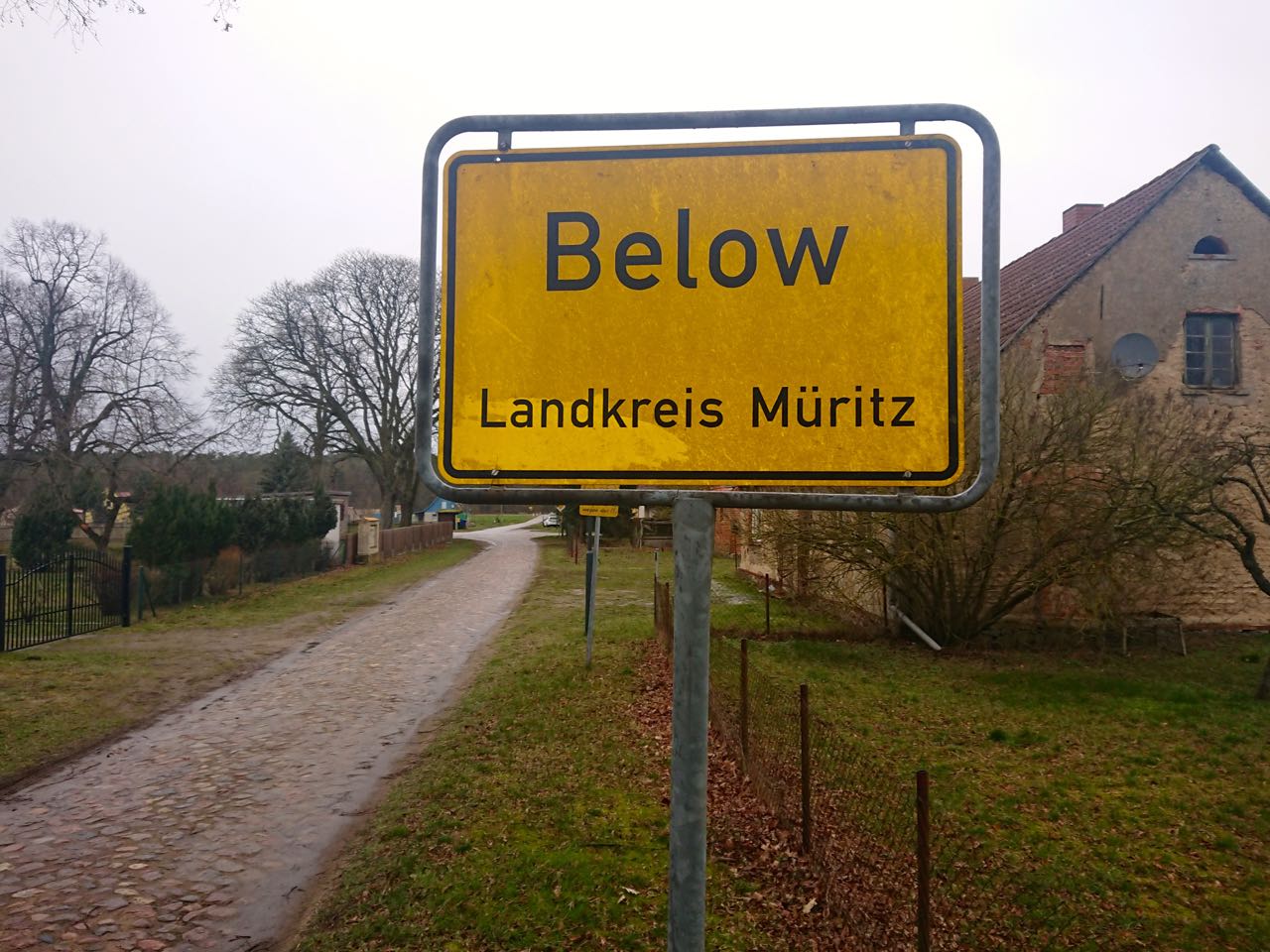 Wer von der Chaussee zwischen Wredenhagen und dem brandenburgischen Wittstock aus – also aus der Schmugglerheide – Richtung Below fährt oder den „Stuckerdamm“ entlang läuft, kommt ja zuerst am Todesmarschmuseum im Belower Wald vorbei. Ein paar Meter weiter verläuft die Landesgrenze, ohne, dass man es merkt, und dann kommt der kleine Ort. Ein Vorposten Mecklenburgs im Brandenburgischen sozusagen und er liegt immer noch – sagt das Schild – im Landkreis Müritz. Vielleicht wird hier ja auch noch Bettina Paetsch als Landrätin geführt.