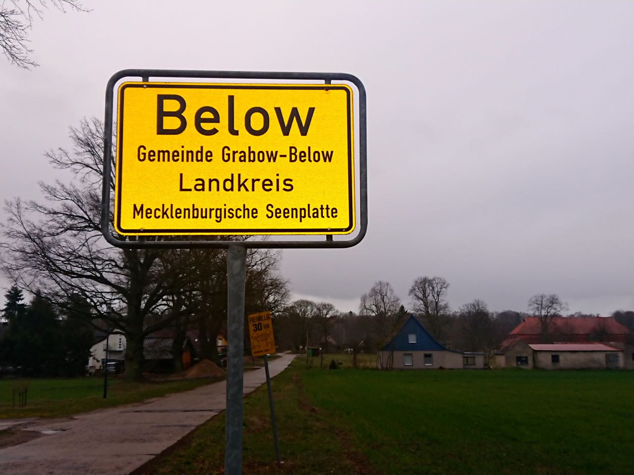 Auf der „Westseite“ Belows steht allerdings ein neueres Schild „Below, Gemeinde Grabow-Below, Landkreis Mecklenburgische Seenplatte“. Aha, sagt sich der unbefangene Besucher, da steckt bestimmt eine sinnvolle Absicht dahinter.