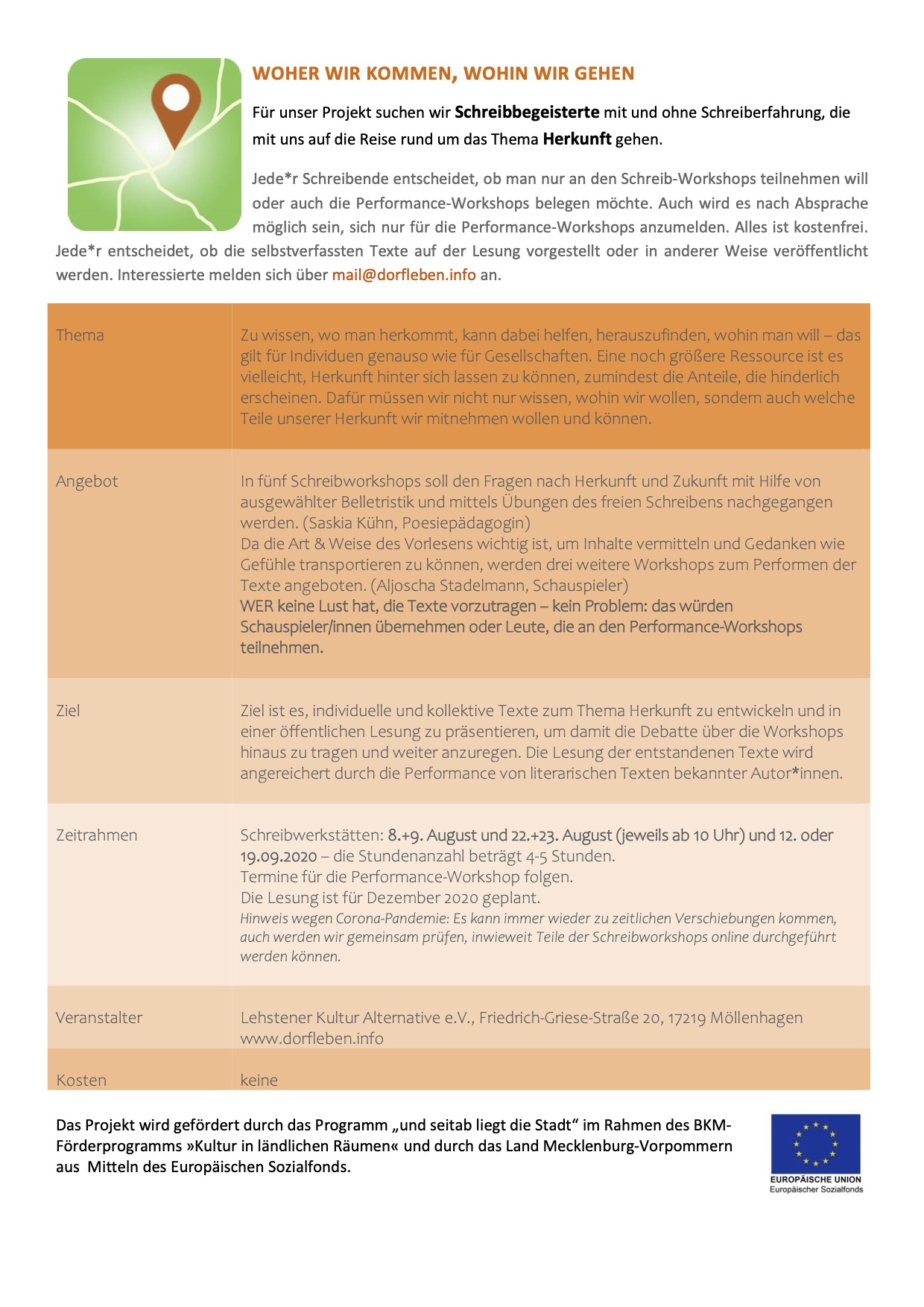 Die Workshops sind kostenfrei und werden gefördert durch das Programm „und seitab liegt die Stadt“ im Rahmen des BKM-Förderprogramms »Kultur in ländlichen Räumen« und durch das Land Mecklenburg-Vorpommern aus Mitteln des Europäischen Sozialfonds.