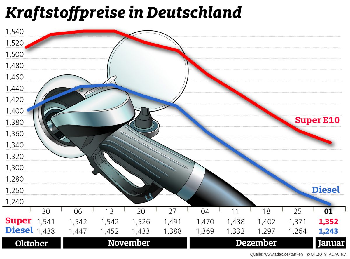 Für Autofahrer erfreulich war hingegen die Preisentwicklung im Dezember 2018. Wie die monatliche Marktauswertung des ADAC zeigt, kostete ein Liter Super E10 im bundesweiten Mittel im Dezember 1,412 Euro und damit 11,4 Cent weniger als im November. Für einen Liter Diesel mussten Autofahrer im Schnitt 1,307 Euro bezahlen, im Vormonat waren es noch 12,4 Cent mehr.