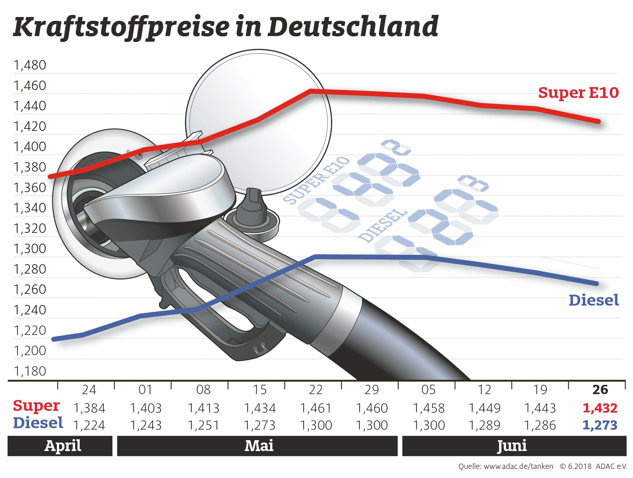 Nachdem Kraftstoff in Deutschland bereits seit Ende Mai günstiger wird, hat sich die Abwärtsentwicklung in der vergangenen Woche noch einmal beschleunigt. Gegenüber der Vorwoche sank der Preis für einen Liter Super E10 nach Angaben des ADAC um 1,1 Cent auf durchschnittlich 1,432 Euro. Ein Liter Diesel verbilligte sich um 1,3 Cent auf 1,273 Cent pro Liter. Ende Mai kostete Super E10 noch 2,8 Cent und Diesel 2,7 Cent mehr.