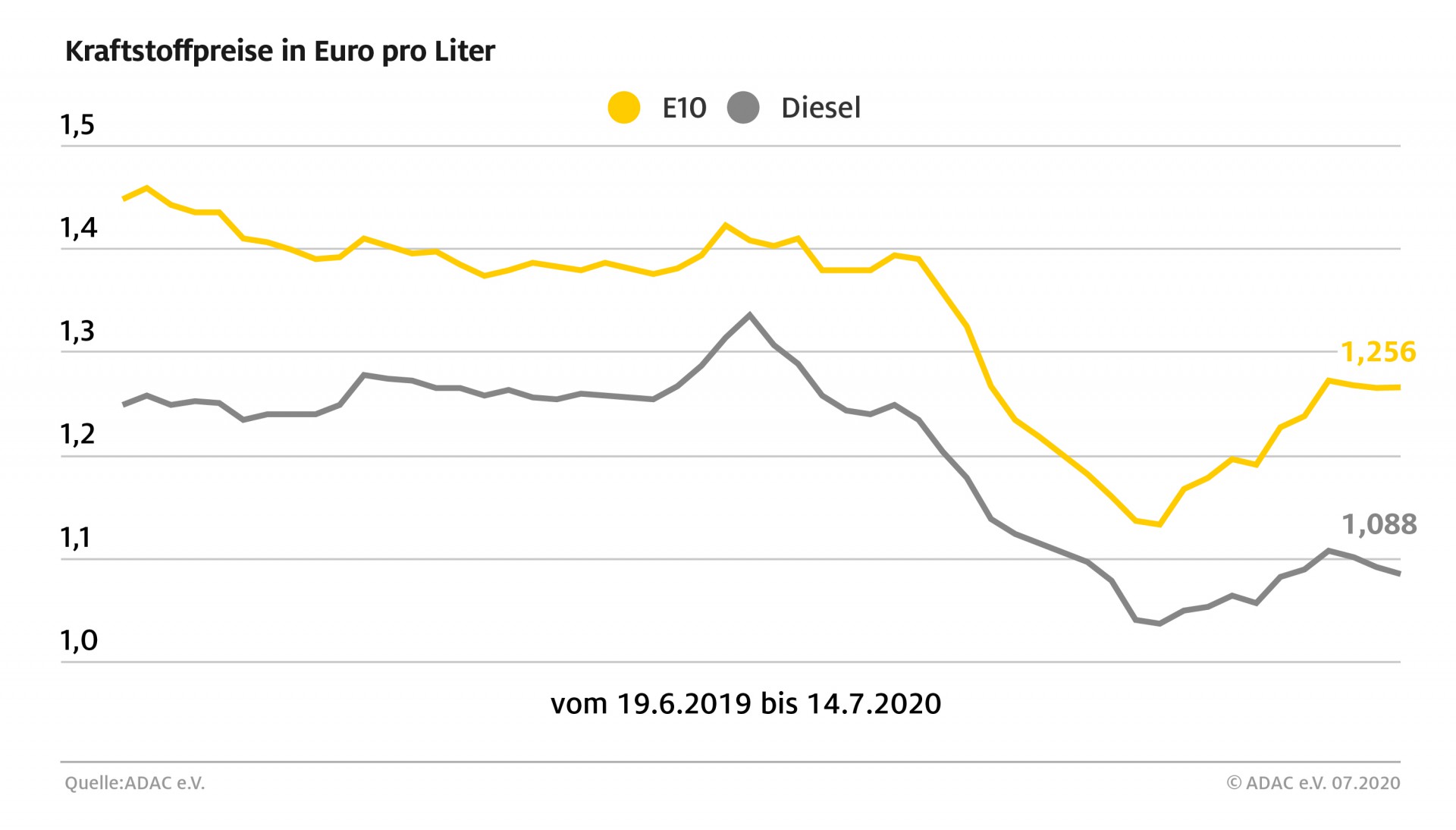 Die Kraftstoffpreise in Deutschland sind im Vergleich zur Vorwoche erneut leicht gesunken. Wie die aktuelle ADAC Auswertung ergibt, kostet ein Liter Super E10 an den deutschen Tankstellen im Schnitt 1,256 Euro. Das ist ein Rückgang zur Vorwoche um 0,4 Cent. Der Preis für einen Liter Diesel sank ebenfalls leicht um 0,5 Cent auf 1,088 Euro.