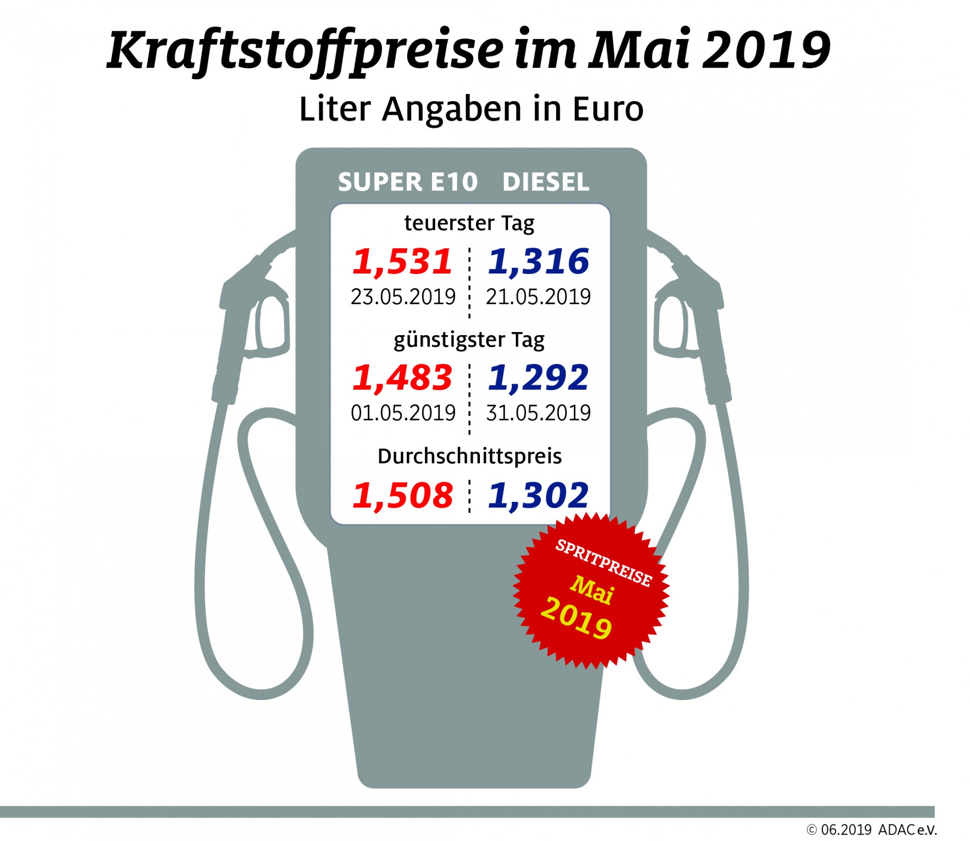Neue Jahreshöchstwerte wurden auch bei den Tagesdurchschnittspreisen erreicht. Am teuersten war Super E10 mit 1,531 Euro pro Liter am 23. Mai. Für Diesel mussten Autofahrer mit durchschnittlich 1,316 Euro am 21. Mai am meisten bezahlen. Am günstigsten konnte man Super E10 im vergangenen Monat mit 1,483 Euro je Liter am 1. Mai tanken. Diesel hingegen war zum Monatsende am preiswertesten. Am 31. Mai kostete der Liter im Mittel 1,292 Euro.