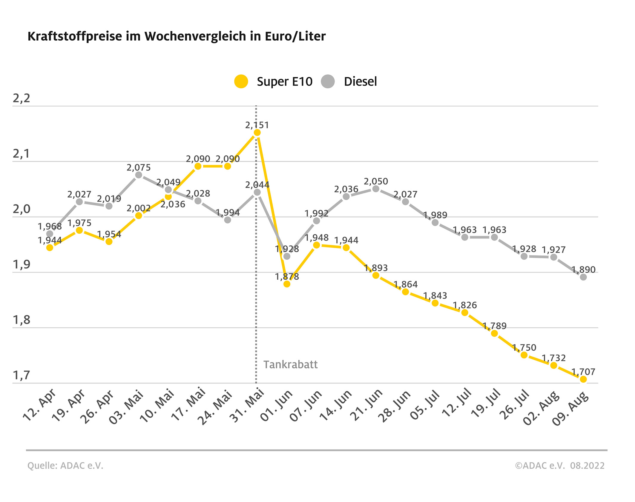 Tanken ist in Deutschland im Vergleich zur Vorwoche deutlich günstiger geworden. Dies gilt insbesondere für Diesel: Wie die aktuelle ADAC Auswertung der Kraftstoffpreise zeigt, kostet ein Liter Diesel im bundesweiten Mittel 1,890 Euro. Im Vergleich zur vergangenen Woche ist dies ein Minus von 3,7 Cent. Der Preis für einen Liter Super E10 sank im selben Zeitraum um 2,5 Cent und liegt aktuell bei 1,707 Euro.