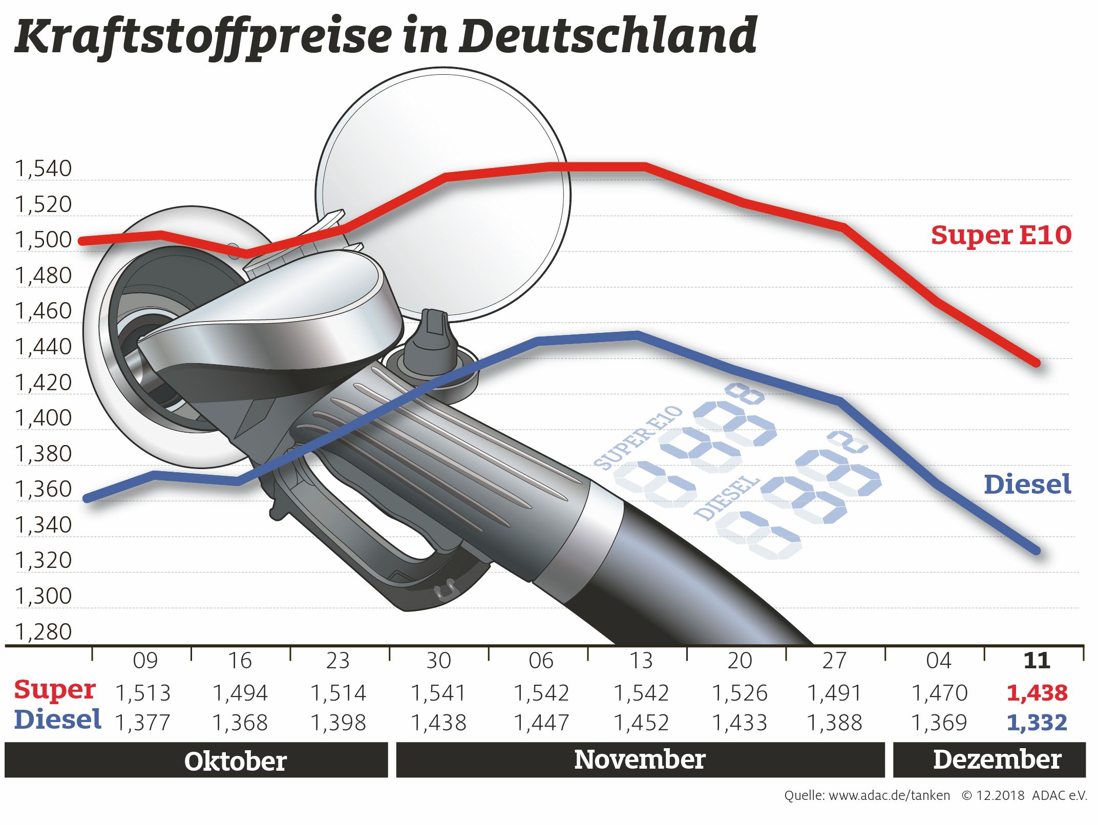 Die Rohölpreise verharrten zuletzt auf einem Niveau von rund 60 Dollar. Trotz des Beschlusses der OPEC, die Fördermengen zu reduzieren, stiegen die Kurse nur vorübergehend an. Ein Barrel der Sorte Brent hat sich am Weltmarkt seit Anfang Oktober um mehr als 25 Prozent verbilligt. Zudem kommen die mittlerweile wieder gestiegenen Pegelstände an Rhein, Main und Mosel der Versorgung Süddeutschlands zugute. Der ADAC sieht weiterhin Spielraum für einen Rückgang der Verbraucherpreise an den Tankstellen.