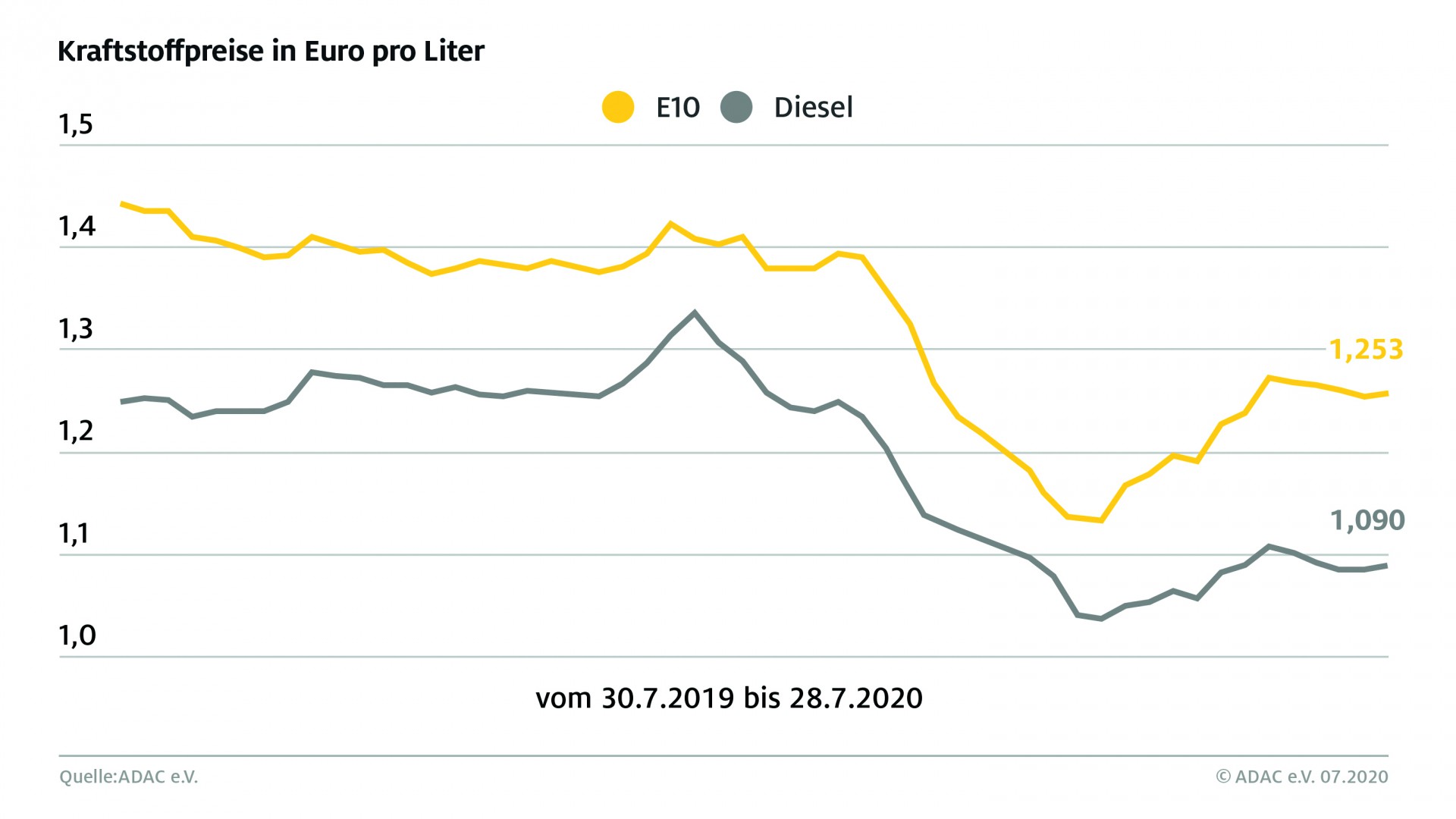 In dieser Woche ist ein leichter Anstieg der Kraftstoffpreise zu verzeichnen. Der ADAC ermittelt für einen Liter Super E10 im bundesweiten Mittel 1,253 Euro. Das entspricht einem Anstieg von 0,3 Cent im Vergleich zur Vorwoche. Ein Liter Diesel liegt bei 1,090 Euro und steigt somit um 0,5 Cent im Vergleichszeitraum.
