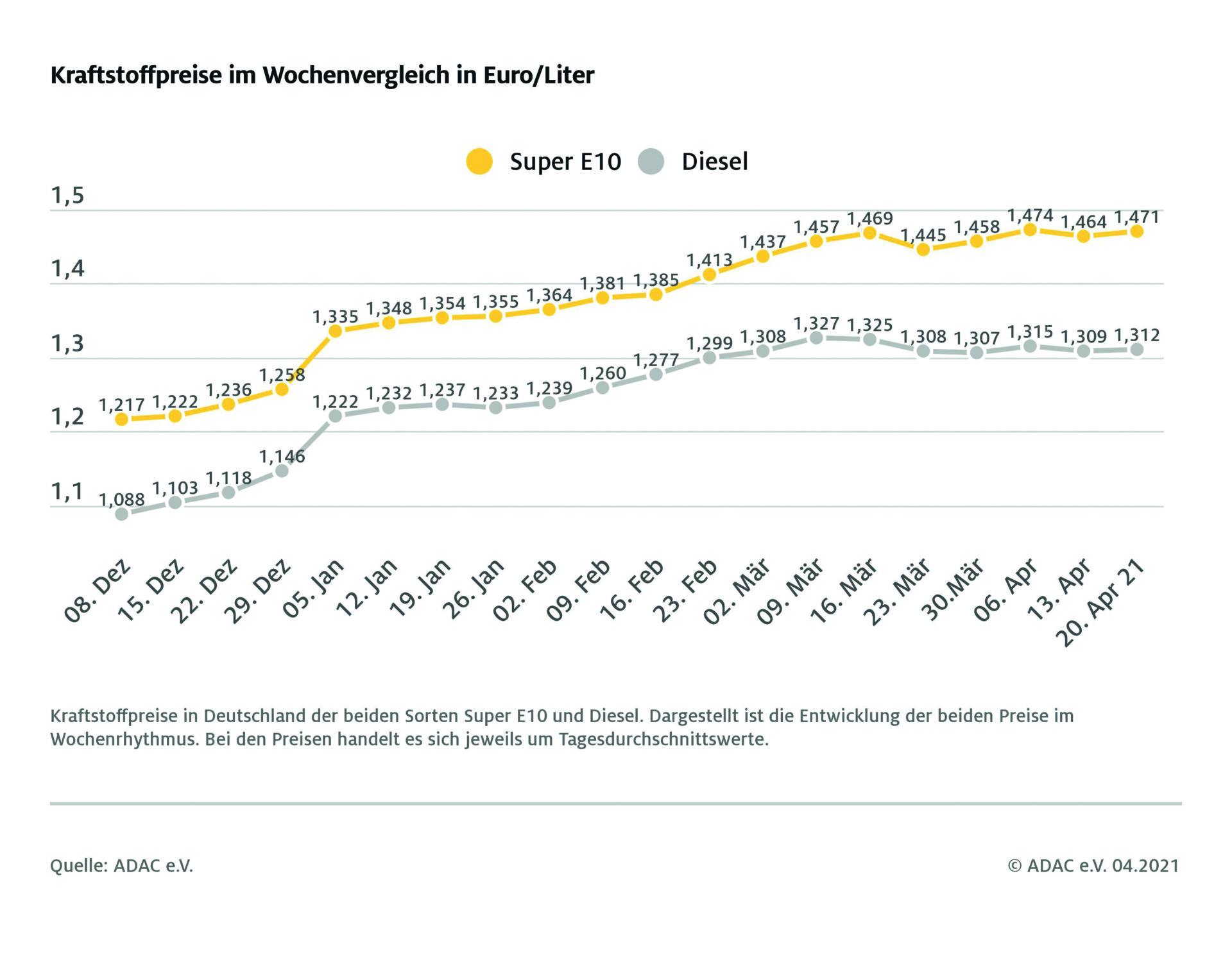 Tanken hat sich in Deutschland leicht verteuert. Dies zeigt die aktuelle ADAC Auswertung der Kraftstoffpreise. Danach kostet ein Liter Super E10 im bundesweiten Mittel 1,471 Euro, das ist ein Anstieg von 0,7 Cent gegenüber der vergangenen Woche. Der Preis für Diesel-Kraftstoff liegt derzeit bei 1,312 Euro und damit um 0,3 Cent über dem Wert der Vorwoche.