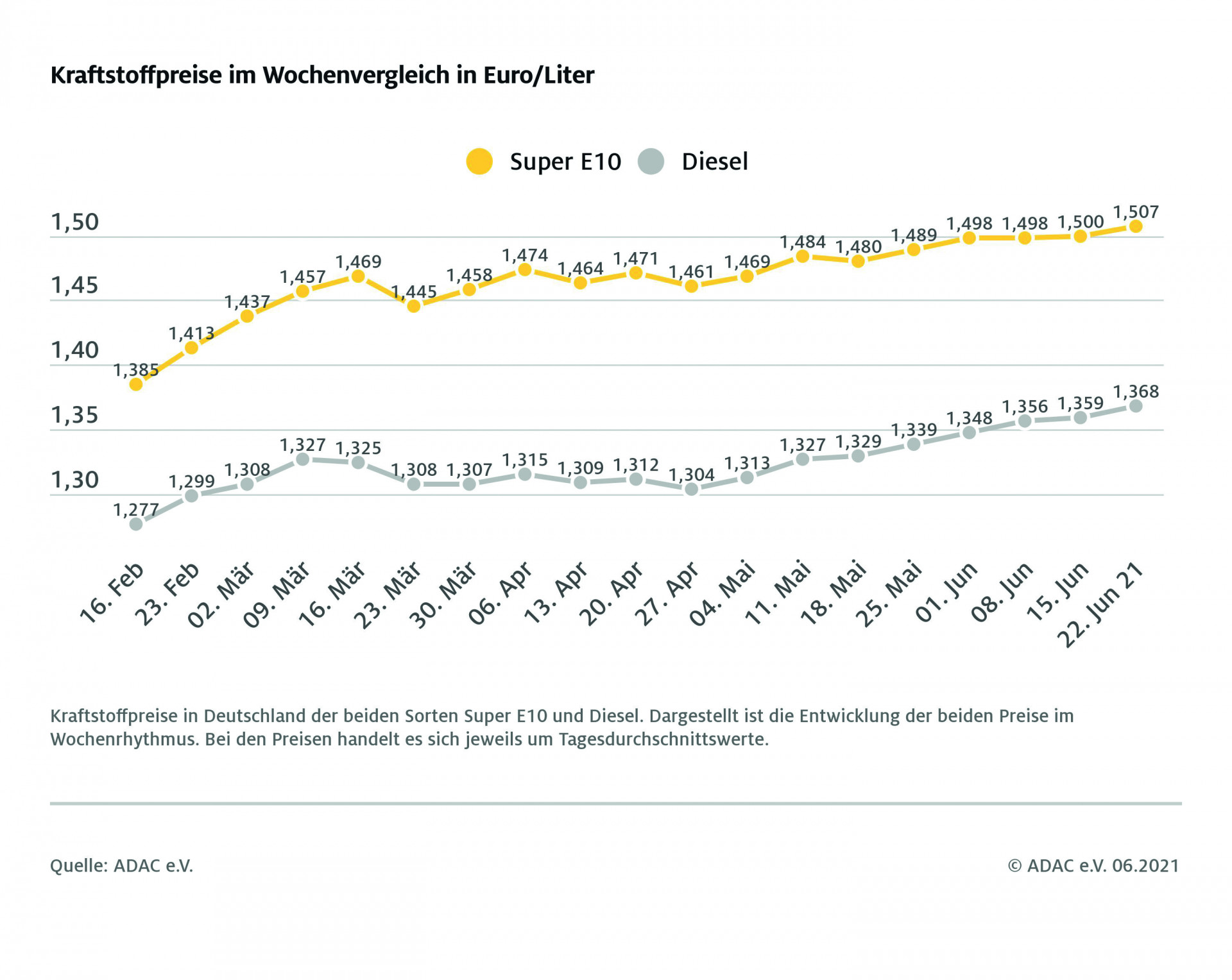 Seit mehreren Wochen kennen die Kraftstoffpreise nur eine Richtung: nach oben. Diese Entwicklung hat sich auch in der vergangenen Woche fortgesetzt, wie die aktuelle ADAC Auswertung der Kraftstoffpreise in Deutschland zeigt. Danach stieg der Preis für einen Liter Super E10 innerhalb einer Woche um 0,7 Cent auf bundesweit 1,507 Euro. Auch die Preiskurve für Diesel-Kraftstoff ging weiter nach oben. Für einen Liter müssen die Autofahrer im Schnitt 1,368 Euro bezahlen, das sind 0,9 Cent mehr.