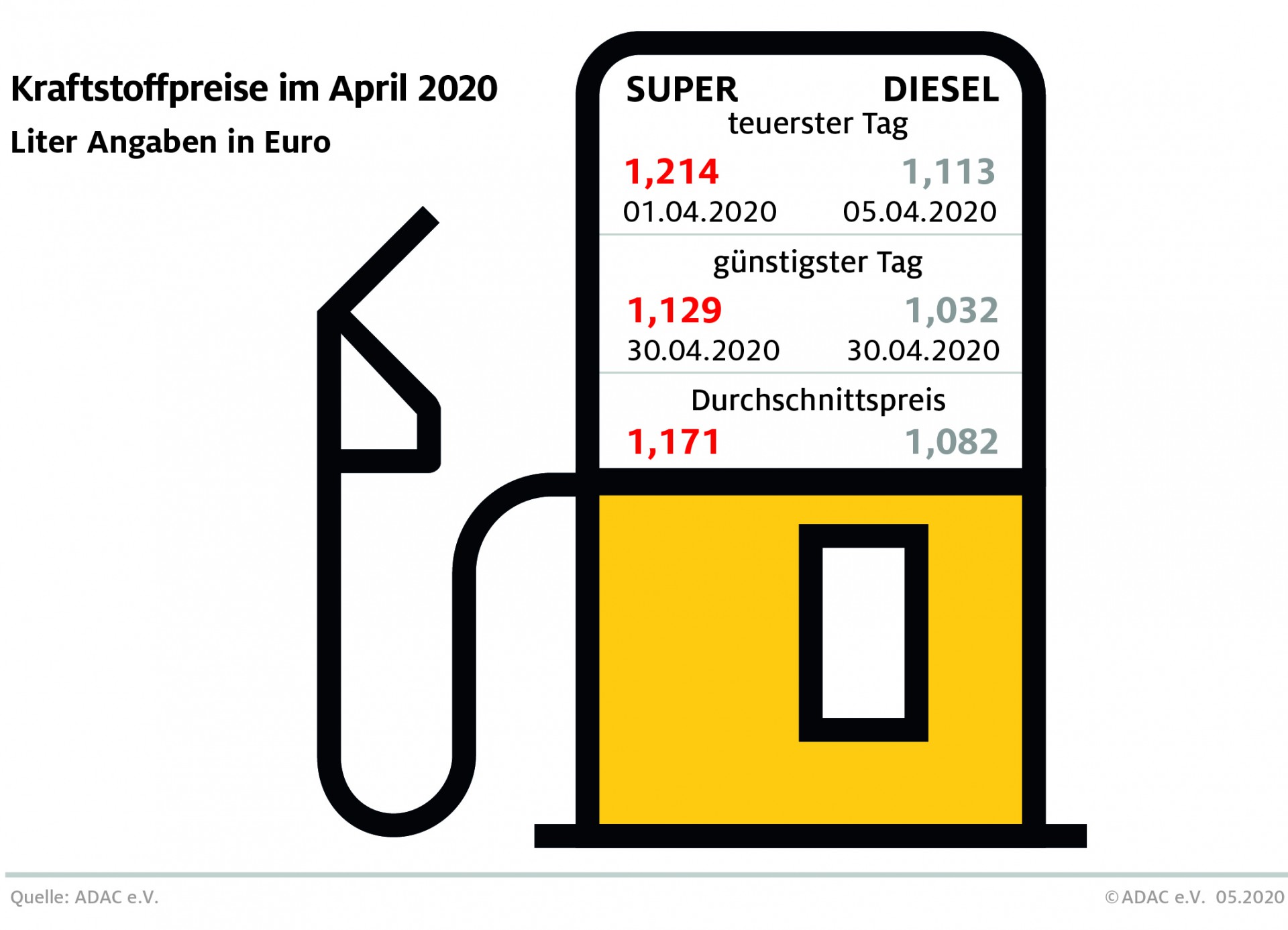 Der Abwärtstrend der Kraftstoffpreise dauert an. Tanken ist im bundesweiten Durchschnitt bereits die elfte Woche in Folge billiger geworden. Kostete ein Liter Super E10 im Bundesmittel in der Vorwoche noch 1,136 Euro, so sind es laut aktueller Auswertung des ADAC in dieser Woche 1,133 Euro. Diesel verbilligte sich ebenfalls um 0,3 Cent auf durchschnittlich 1,037 Euro je Liter.